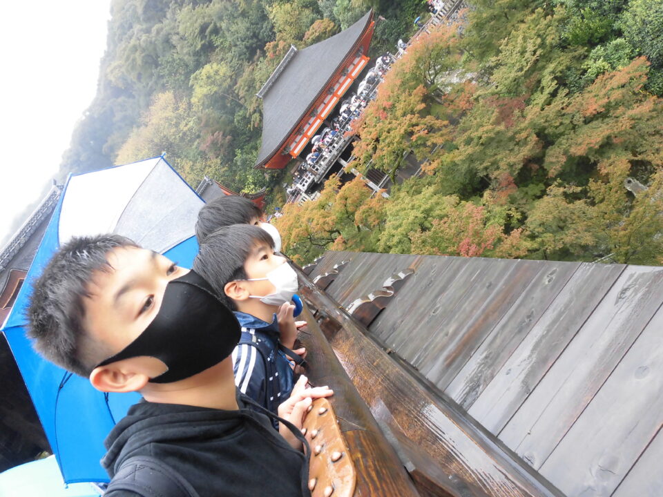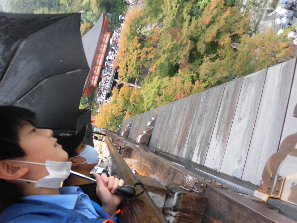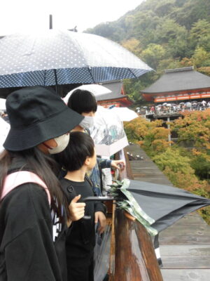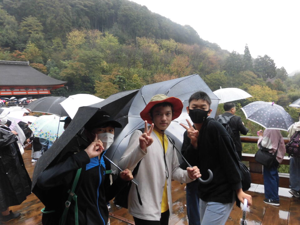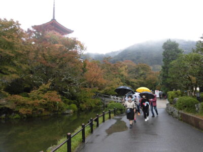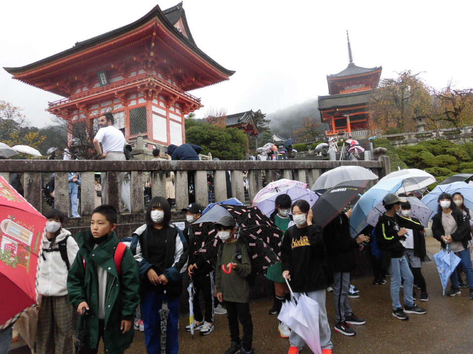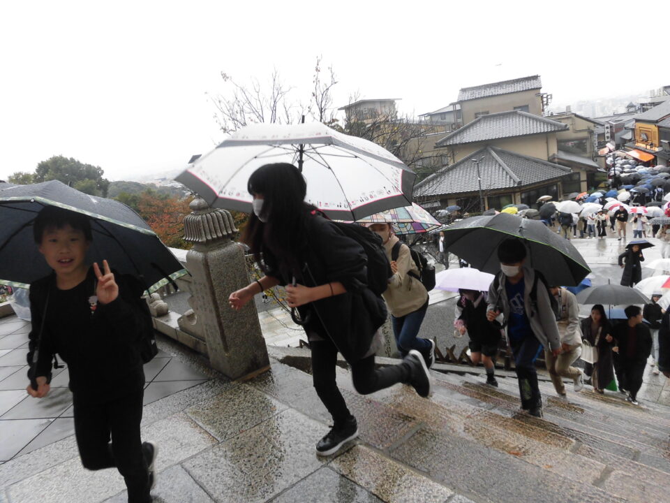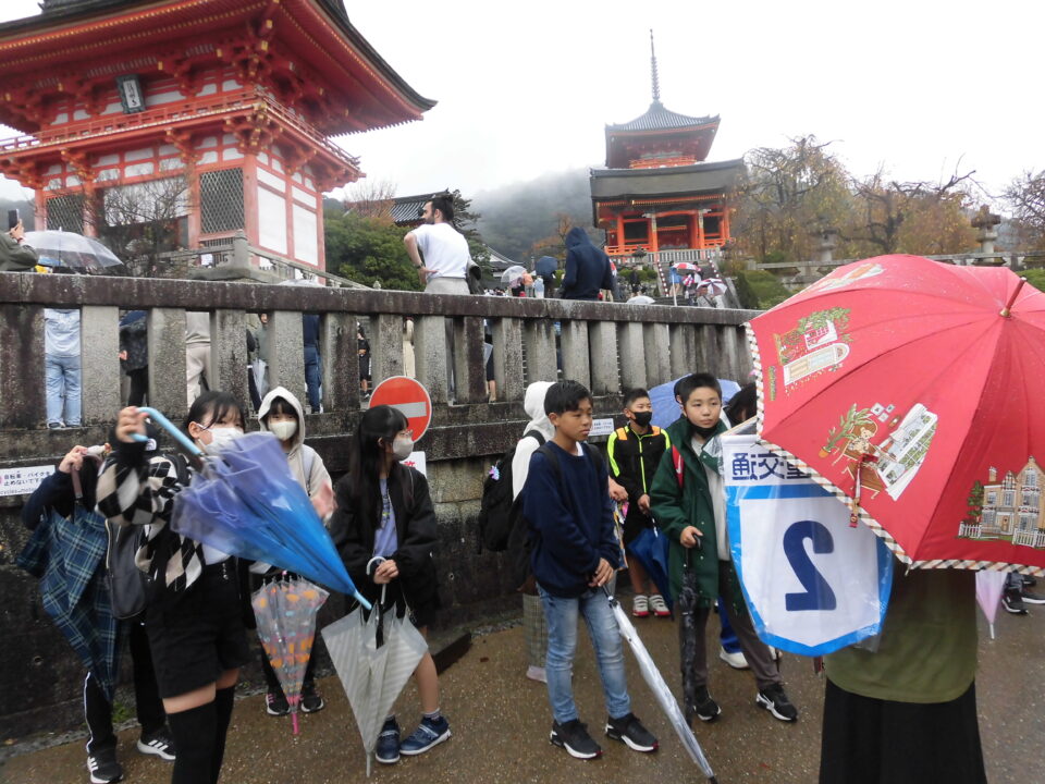 清水寺の駐車場に着くと、観光や修学旅行の人などたくさんの人でにぎわっていました。そのうえ小雨がぱらついていてたいへんでした(>_<)