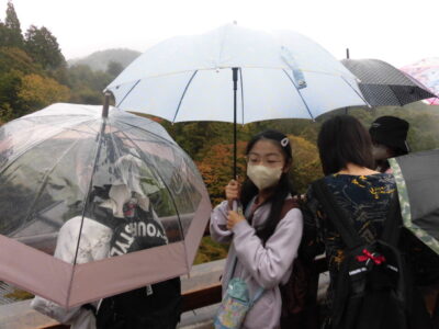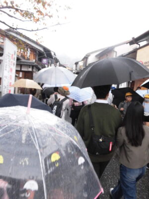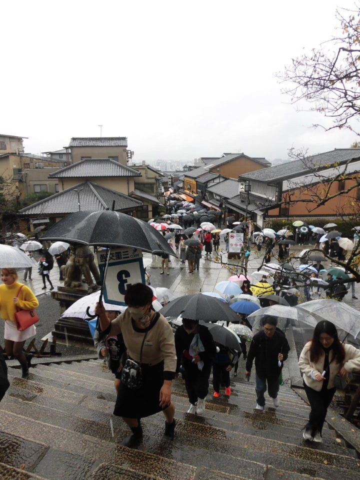 清水寺きよみずでら駐車場ちゅうしゃじょうくと、観光かんこう修学旅行しゅうがくりょこうひとなどたくさんのひとでにぎわっていました。そのうえ小雨こさめがぱらついていてたいへんでした(>_<)