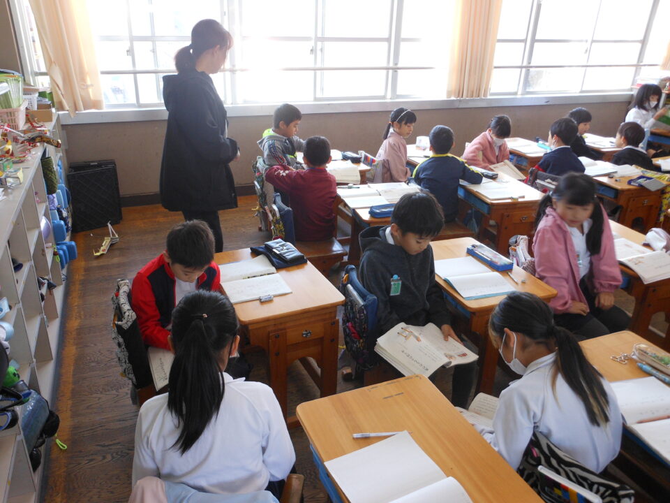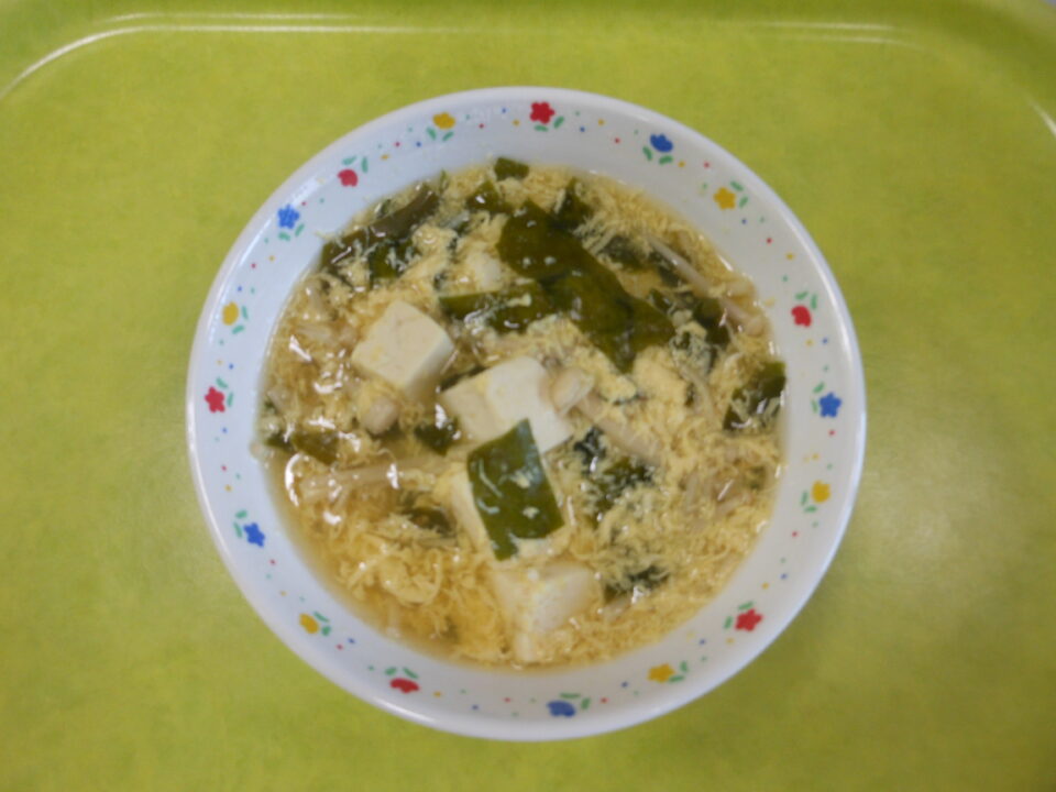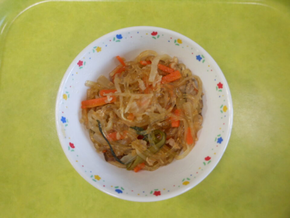 今日きょう給食きゅうしょくは、ごはんむぎり)、牛乳ぎゅうにゅう、チャプチェ、たまごとわかめのスープでした。