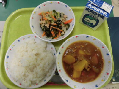 今日の給食は、ご飯、ポークカレー、牛乳、海そうサラダ
