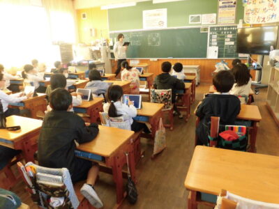 4年生では、スタディサプリをしていました。算数の時間に学習したことの復習をしていました。