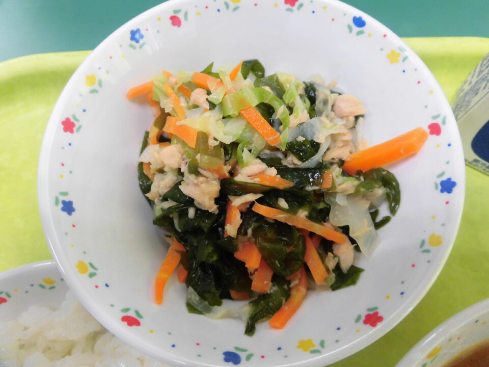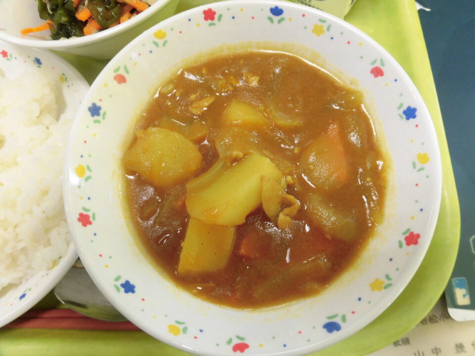 今日の給食は、ご飯、ポークカレー、牛乳、海そうサラダ