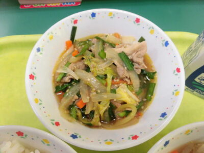 今日の給食は、ご飯(麦入り)、牛乳、プルコギ、ワンタンスープでした。