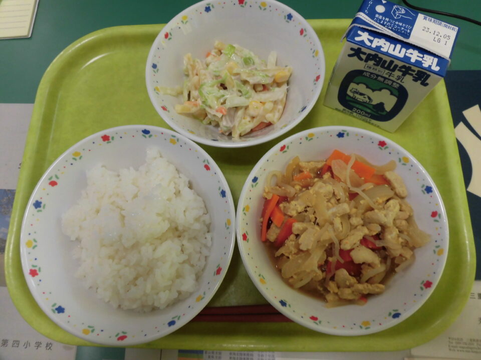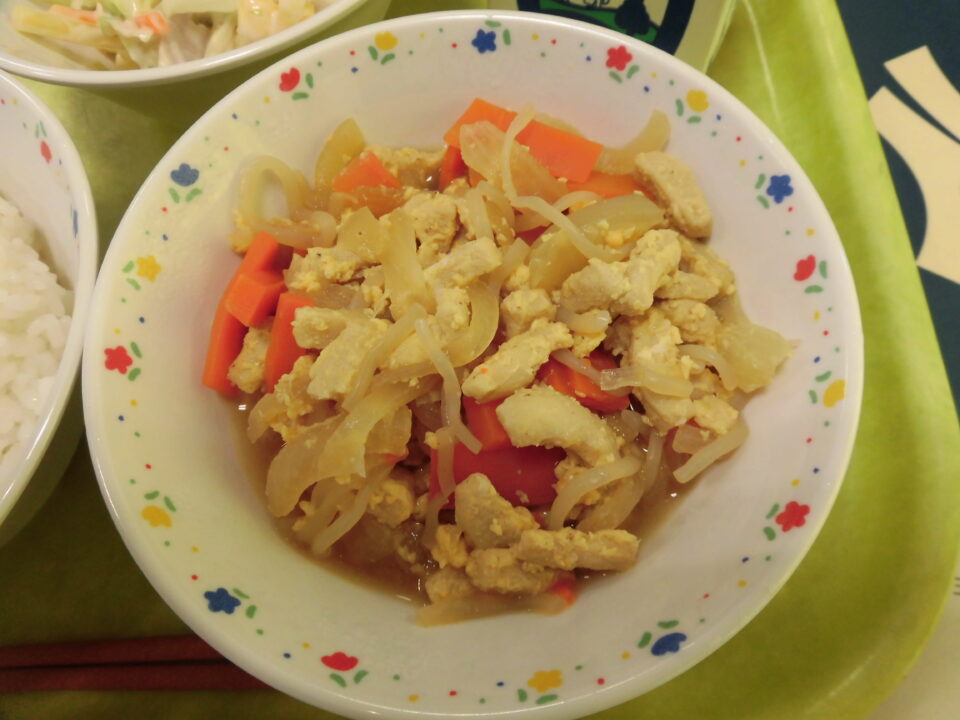 今日きょう給食きゅうしょくは、ごはん牛乳ぎゅうにゅう高野豆腐こうやどうふの卵《と