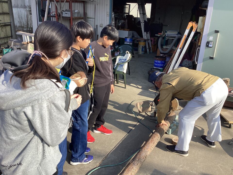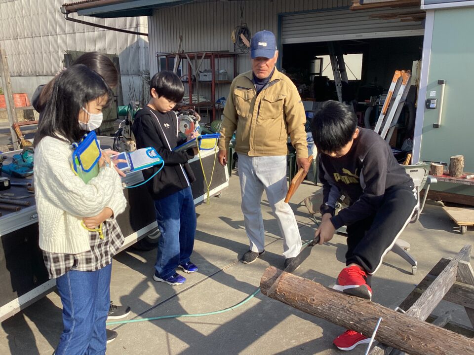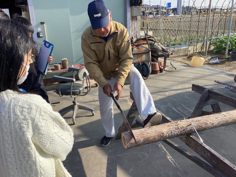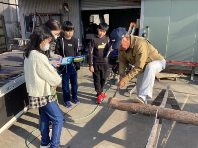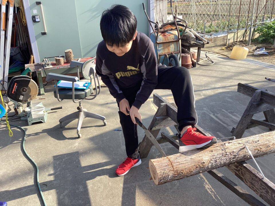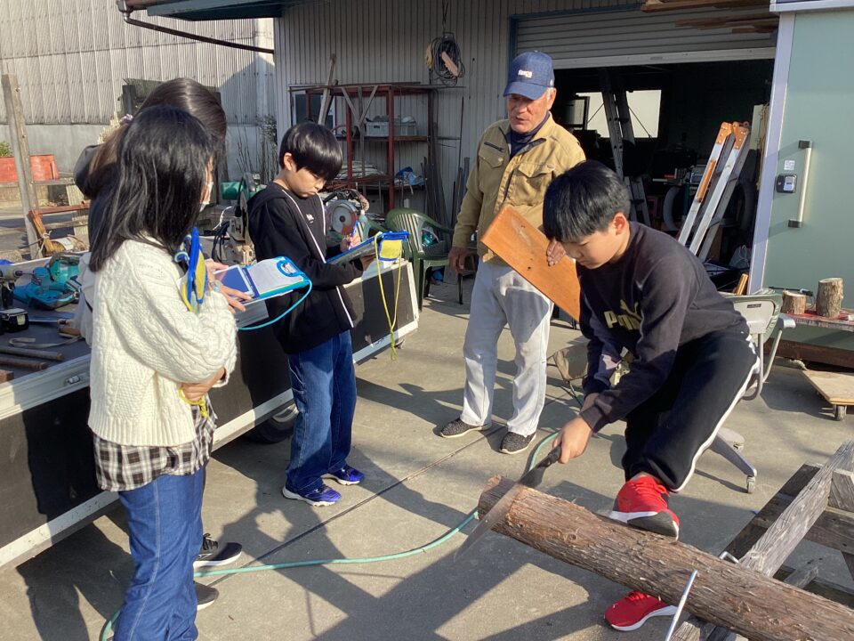 のこぎりをひく見本みほんせていただき、どもたちも挑戦ちょうせんさせていただきました。