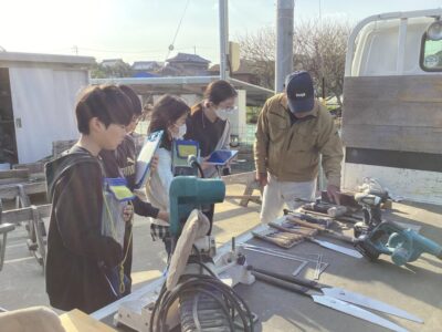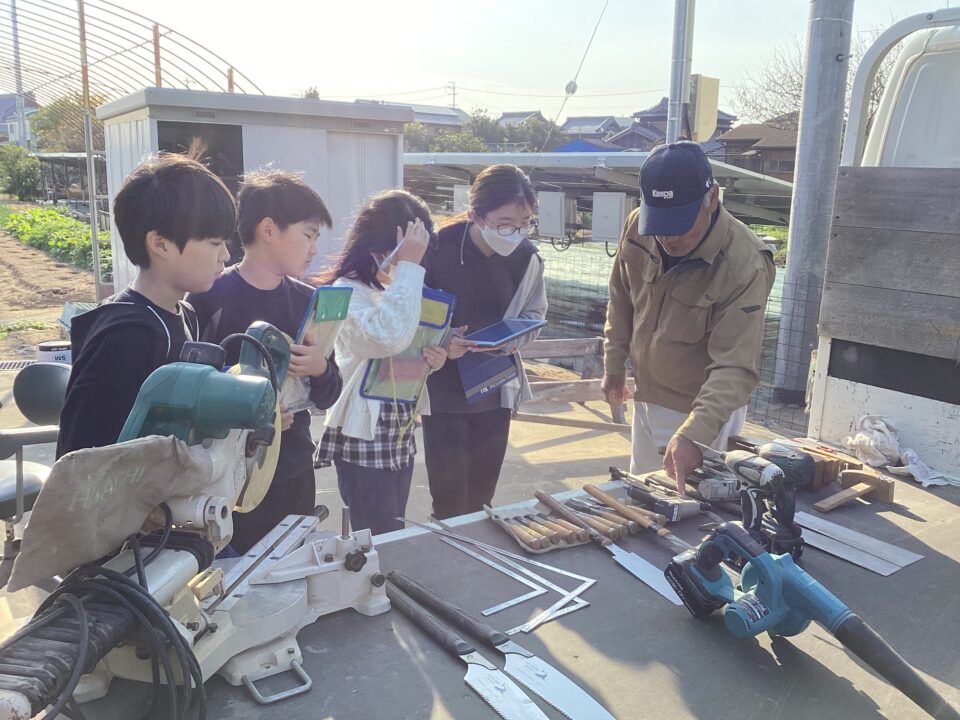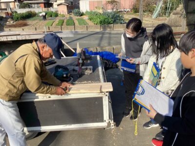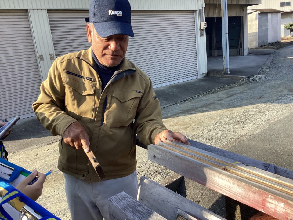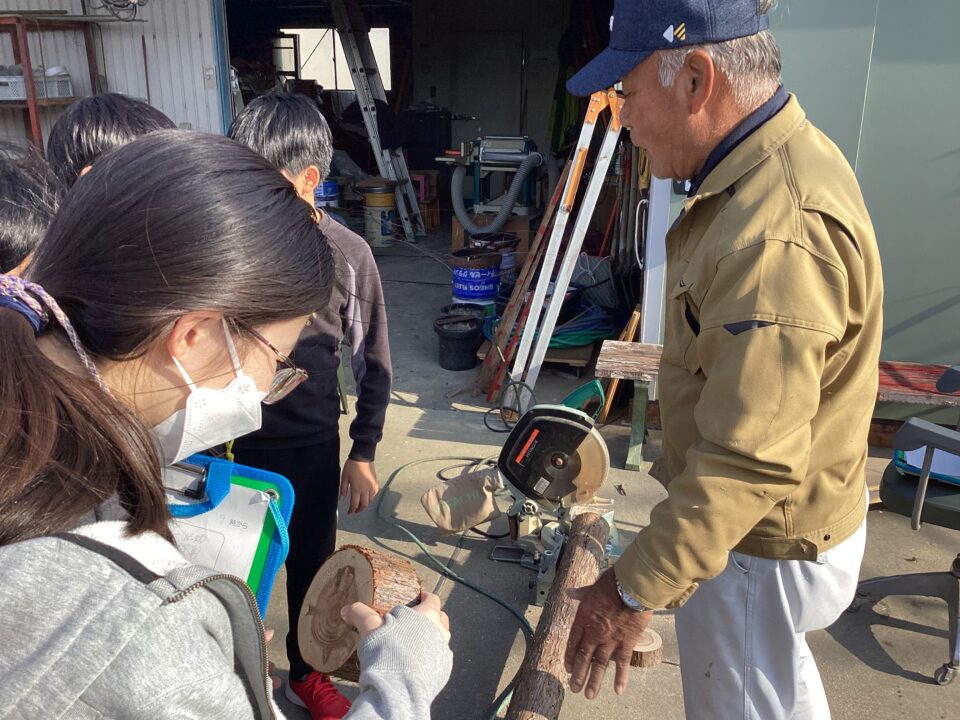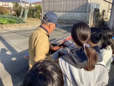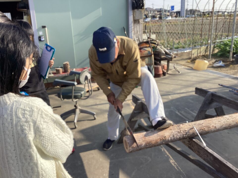 のこぎりをひく見本みほんせていただき、どもたちも挑戦ちょうせんさせていただきました。