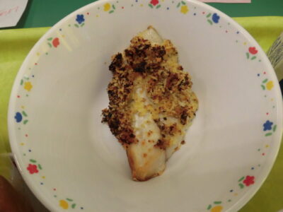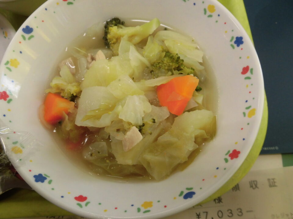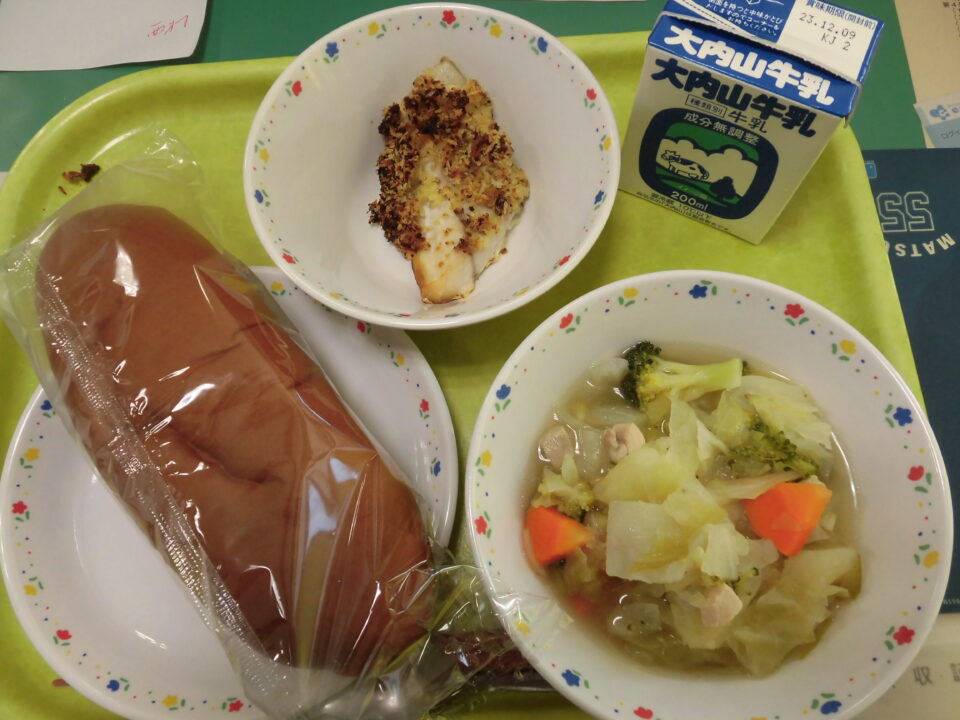 今日の給食は、黒糖パン、牛乳、さわらのハーブグリル、野菜のスープ煮でした。