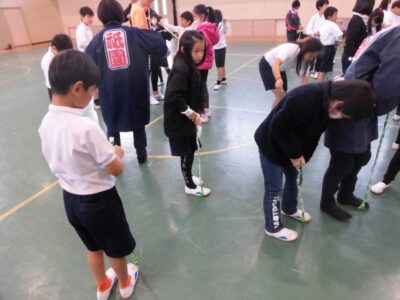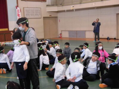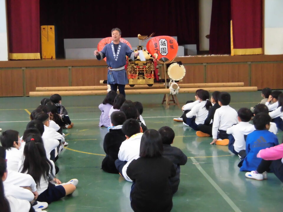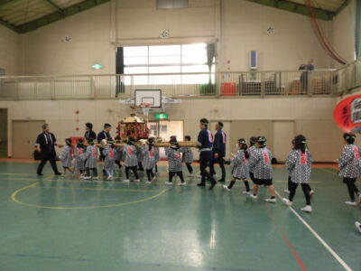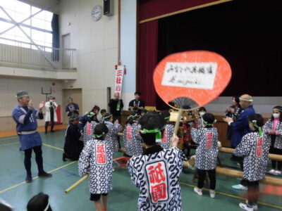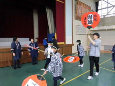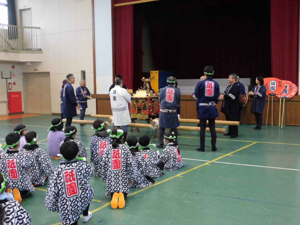 今日は、午後から三社小若みこし世話人会の方々にお越しいただき、例年、松阪市の祇園祭で行われている小若みこしについて説明をしていただき、実際にかけ声のかけ方を教えていただいたり、神輿をかついで歩く体験をさせていただいたりしました。