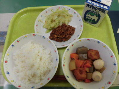きょうの給食は、一口おでん、納豆みそ、香味漬けでした。