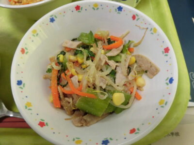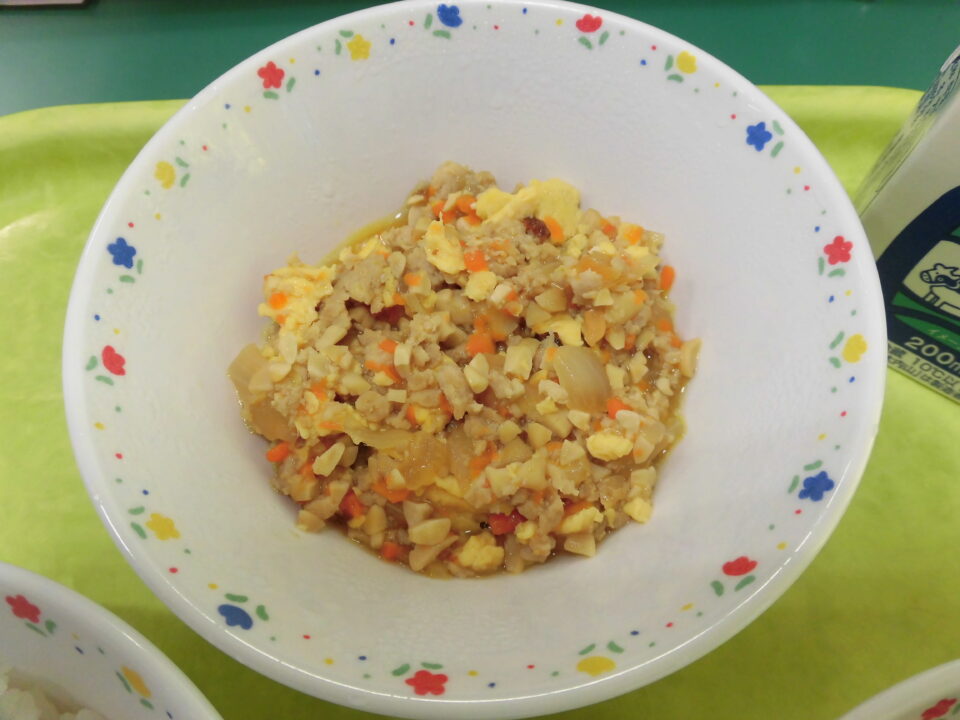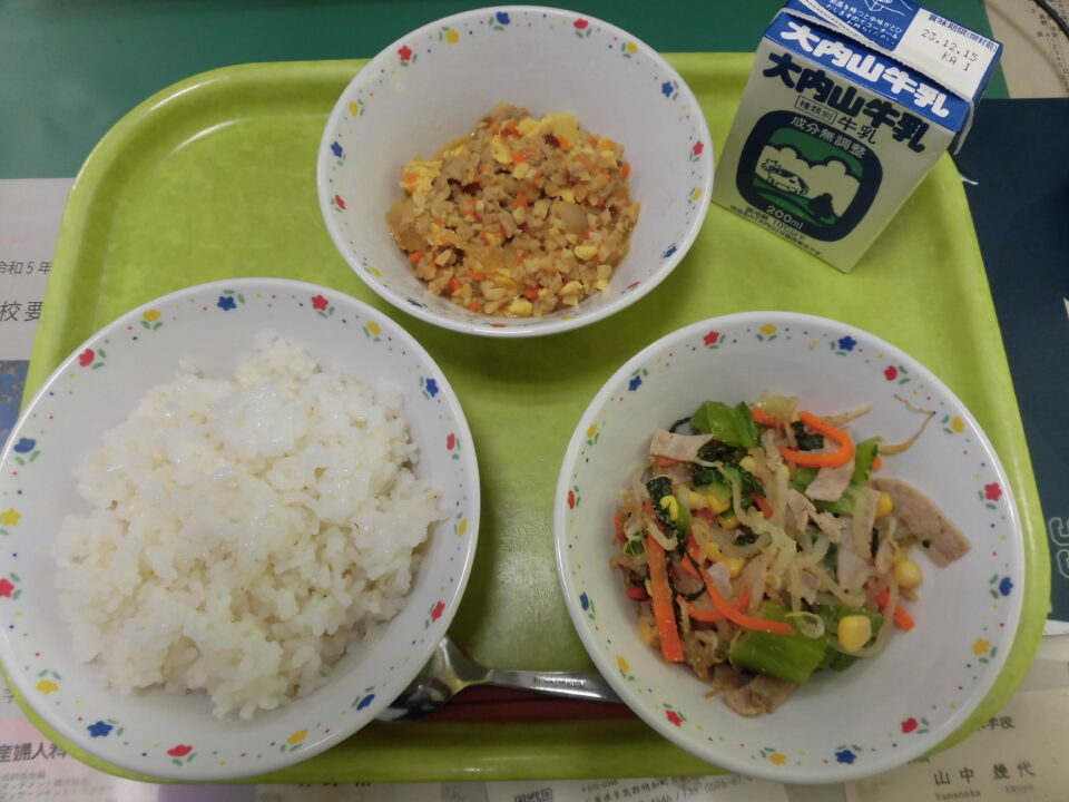 今日の給食は、ご飯(麦入り)、鶏そぼろ、牛乳、五色和えでした。