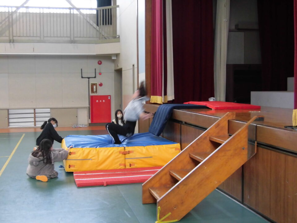 台上前転の練習もいきなり跳び箱の上で回るのではなく、まずはマットを使って高さに慣れる練習です。