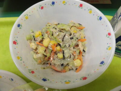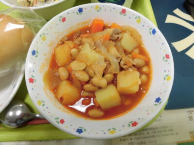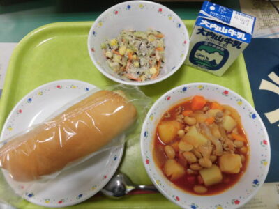 今日の給食は、コッペパン、牛乳、ポークビーンズ、ひじきマヨサラダでした。