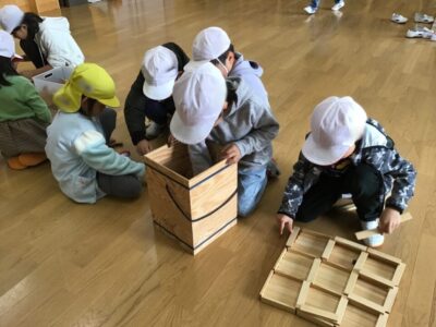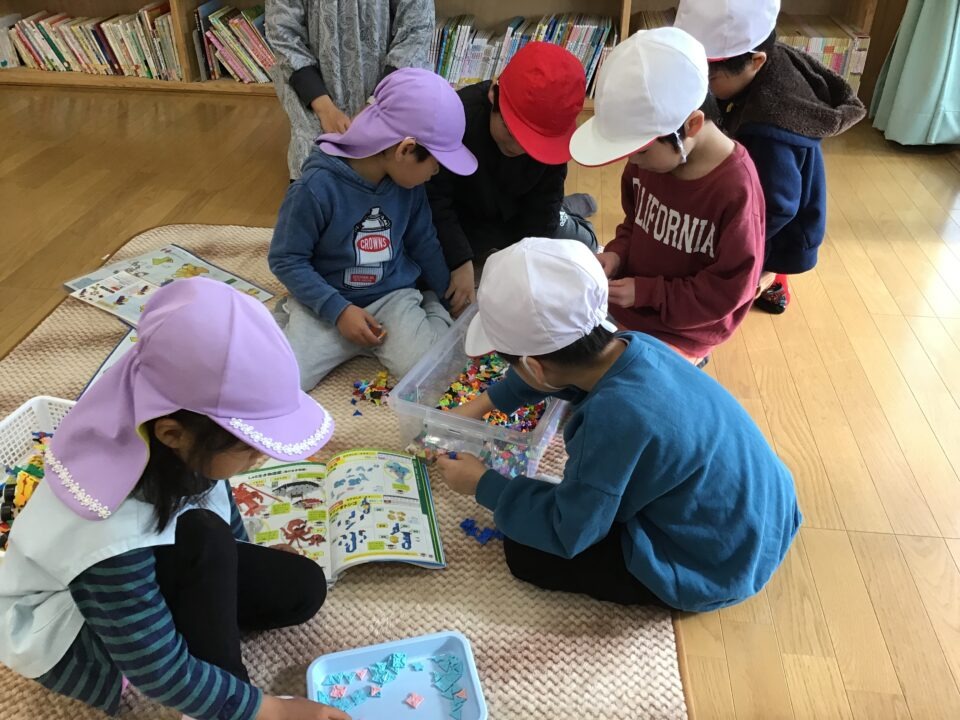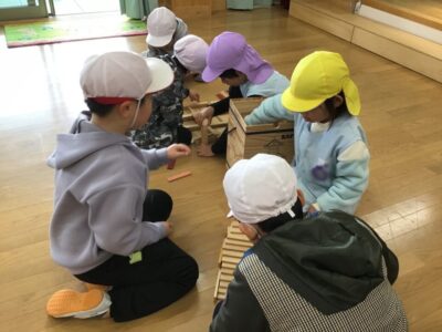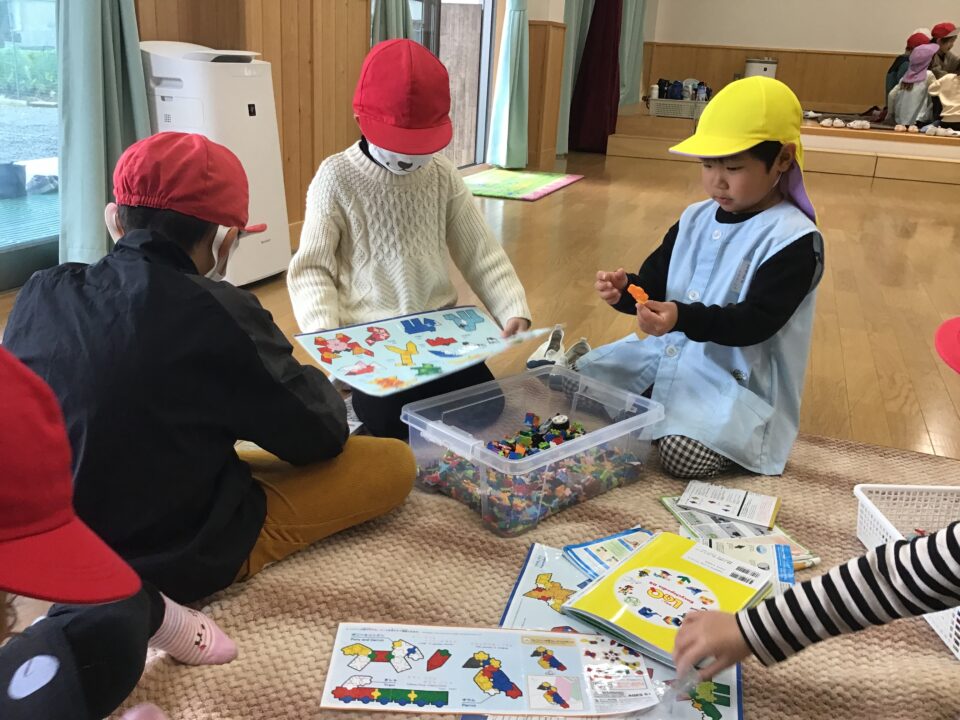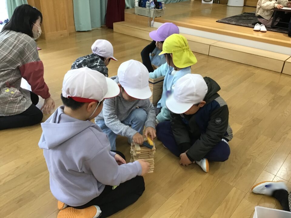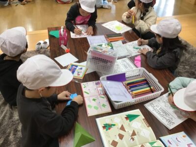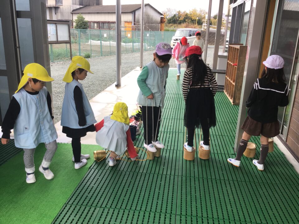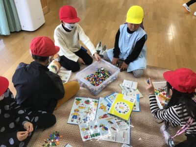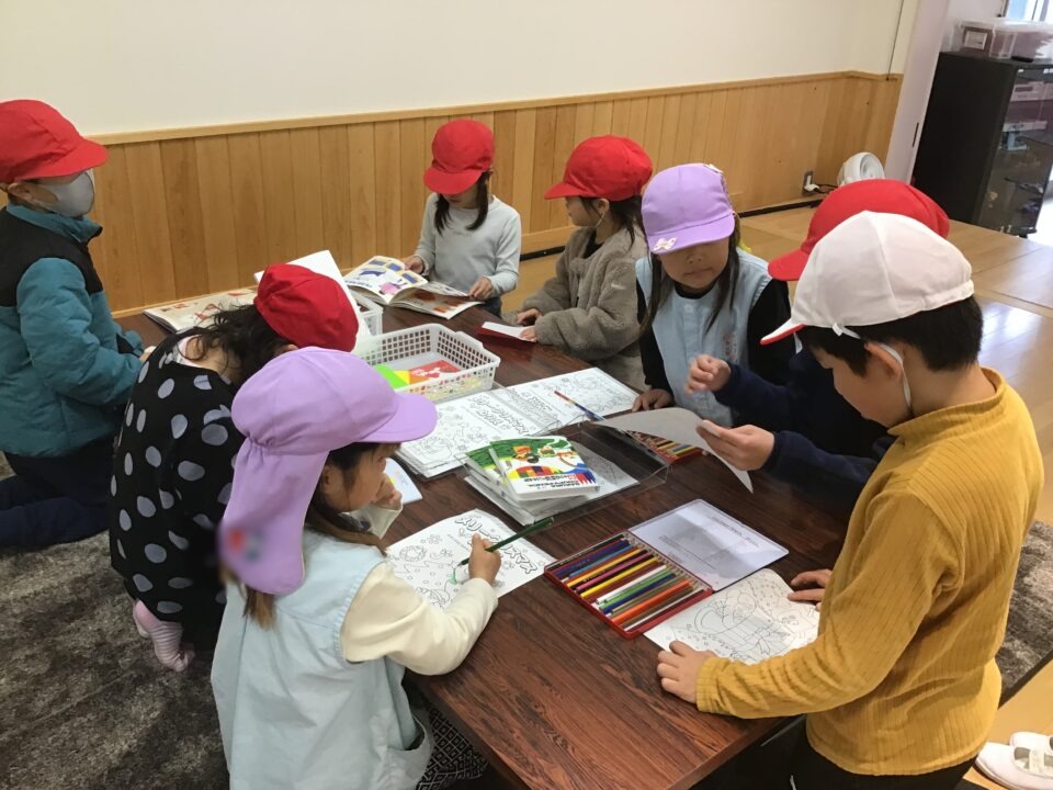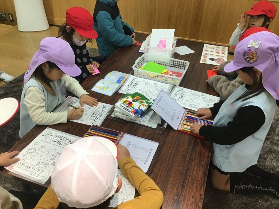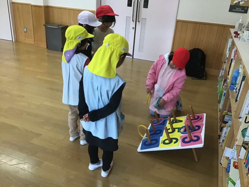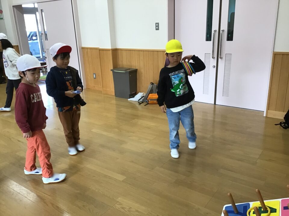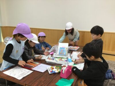 幼稚園では、一緒に塗り絵や折り紙をしたり、缶ぽっくり、カプラ、輪投げなどもしたりしました。