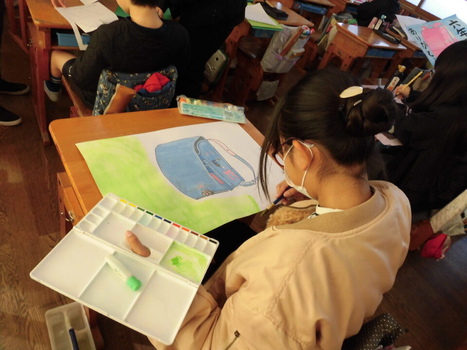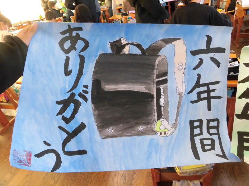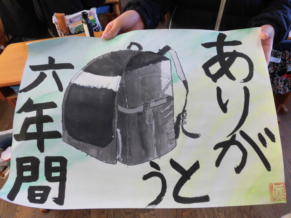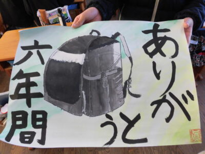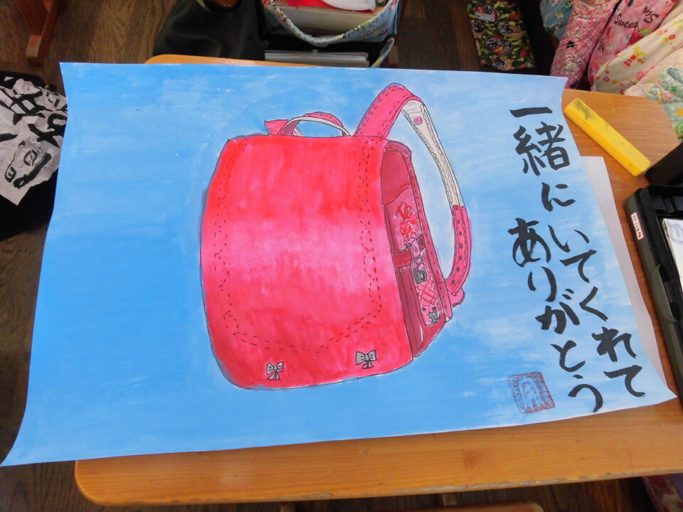 図工ずこうでランドセルをき、毛筆もうひつでメッセージをれています。