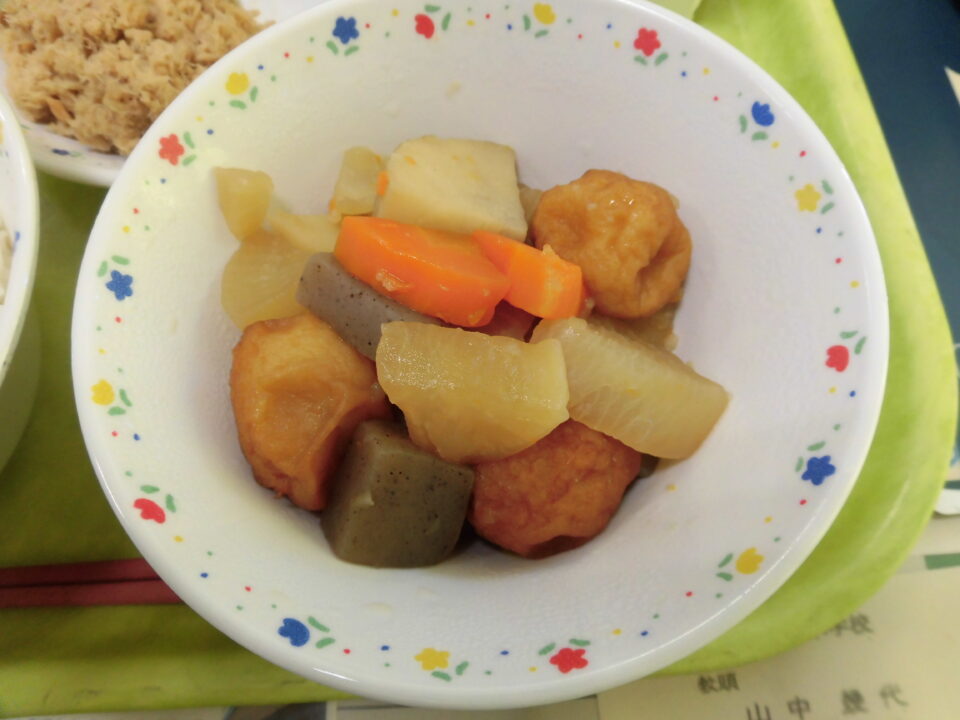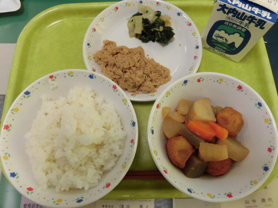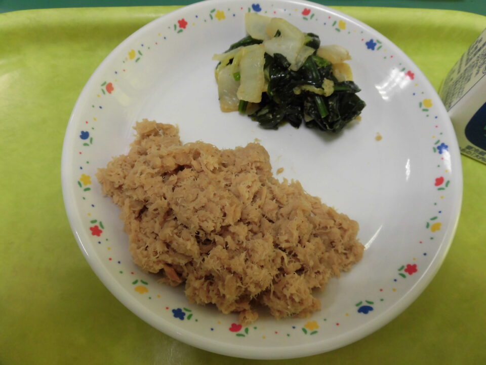 今日きょう給食きゅうしょくは、ごはん牛乳ぎゅうにゅう、ツナそぼろ、ほうれん草入そういりごまえ、かんとうでした。