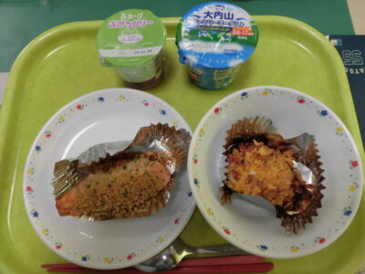 今日のメニューは、米粉入りパン、牛乳、チキンのフレーク焼きか鮭のカレー米粉パン粉焼きのどちらか、具だくさんスープ、ぶどうゼリーかヨーグルトのどちらかでした。