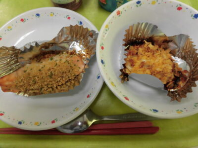 チキンのフレーク焼き か 鮭のカレー米粉パン粉焼きのどちらかを選べます。