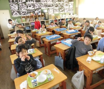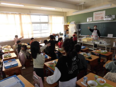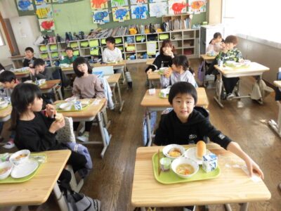 5年生は、給食準備をして今から「いただきます!」のあいさつです。