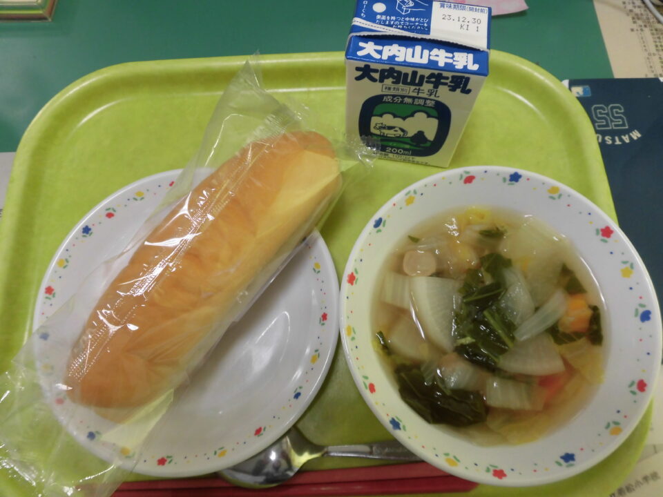 今日のメニューは、米粉入りパン、牛乳、チキンのフレーク焼きか鮭のカレー米粉パン粉焼きのどちらか、具だくさんスープ、ぶどうゼリーかヨーグルトのどちらかでした。