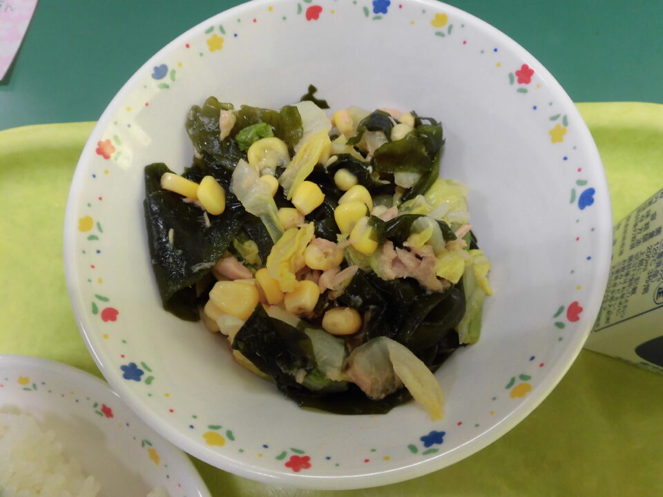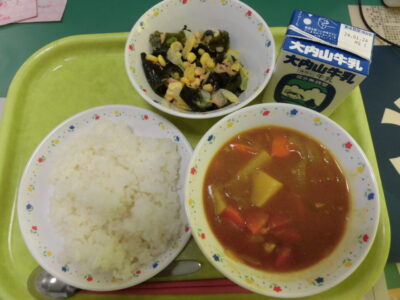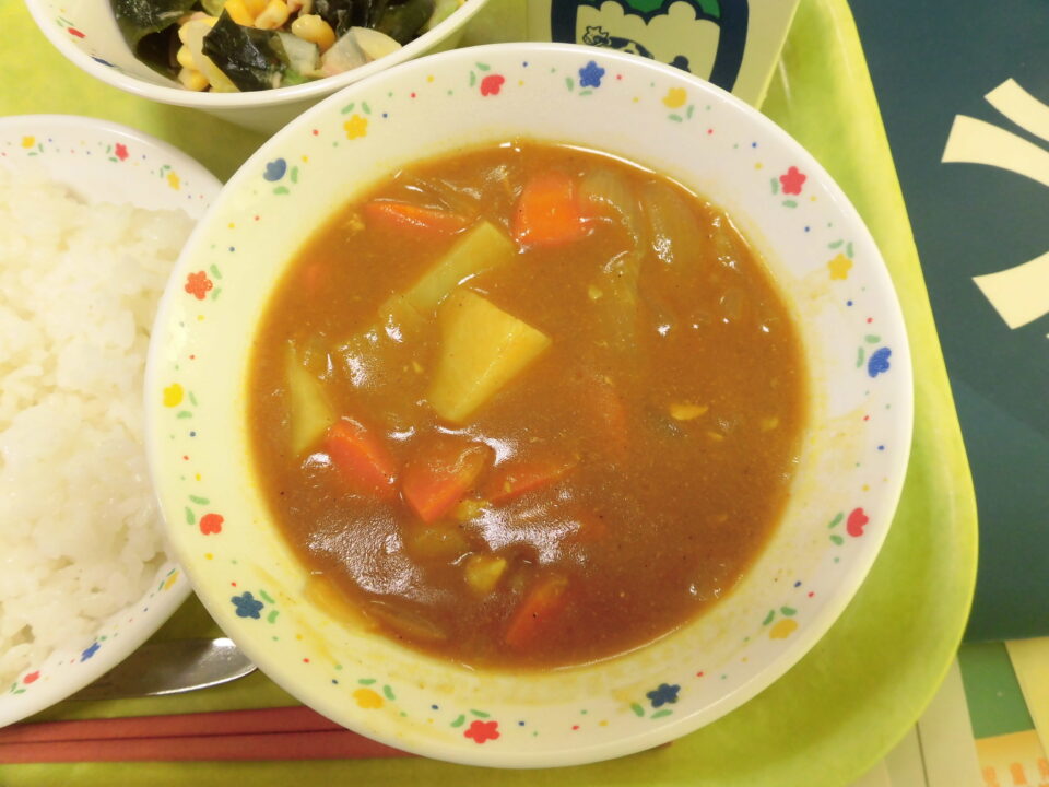 今日の給食は、ご飯、チキンカレー、牛乳、白菜とツナのサラダでした。