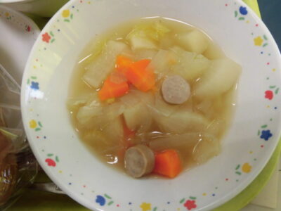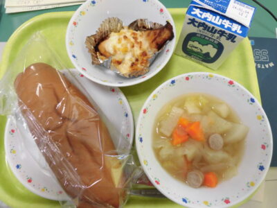 今日きょう給食きゅうしょくは、黒糖こくとうパン、牛乳ぎゅうにゅう、さけのつぶコーンき、冬野菜ふゆやさいのポトフでした。