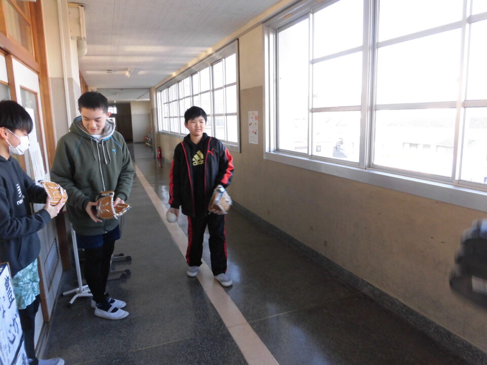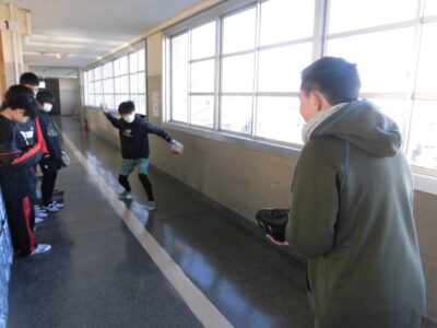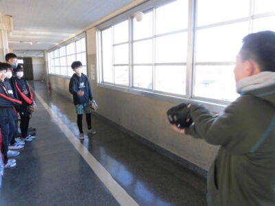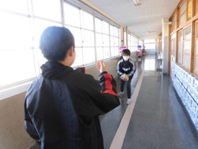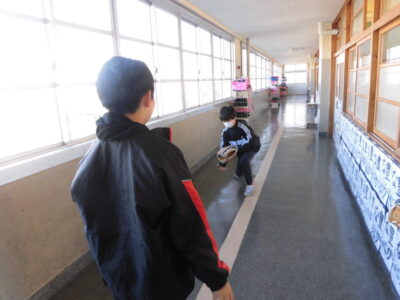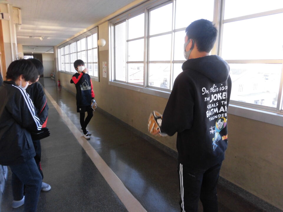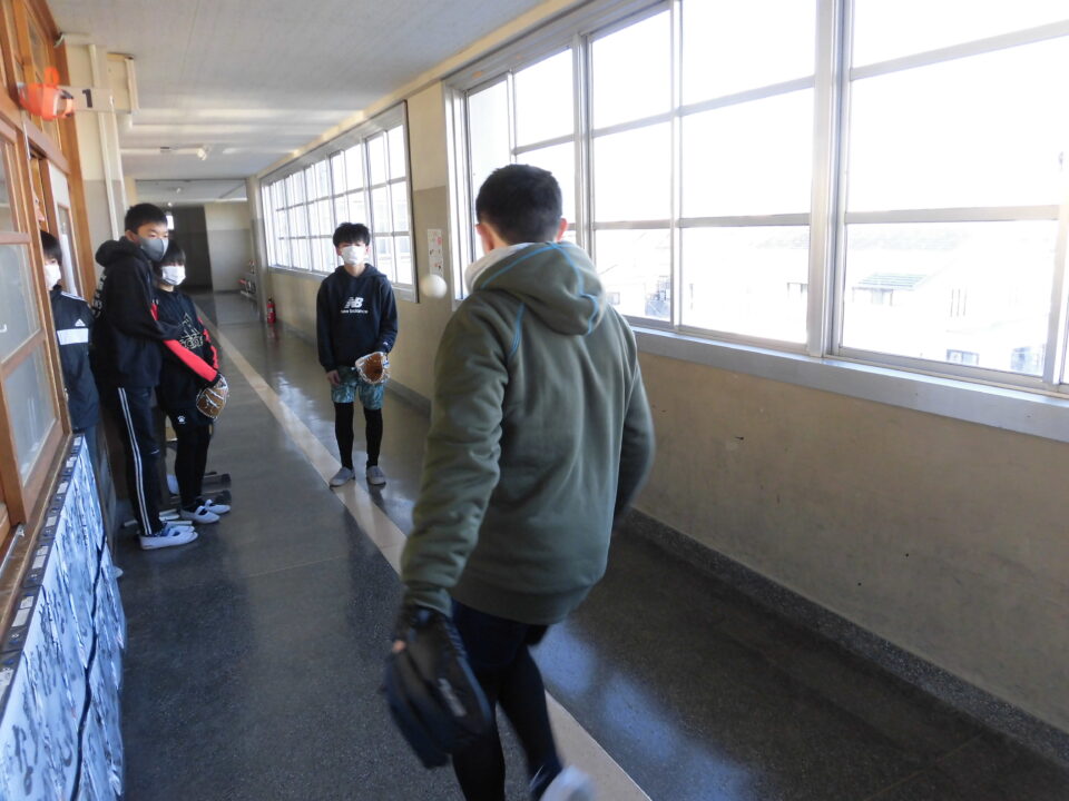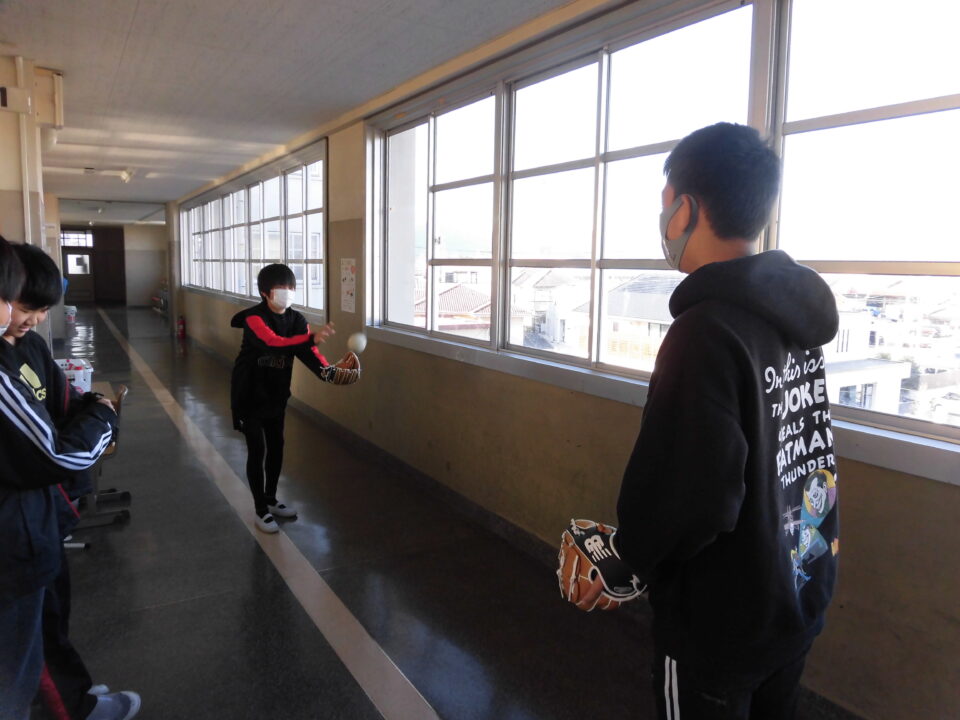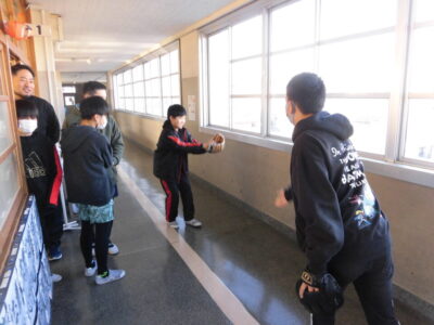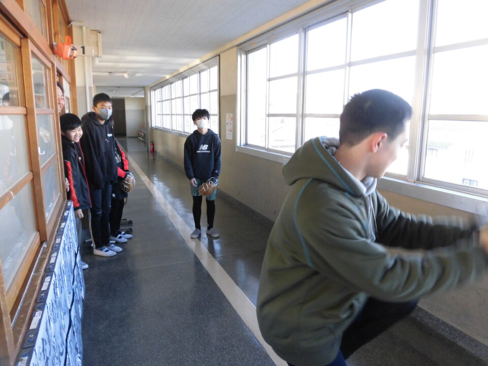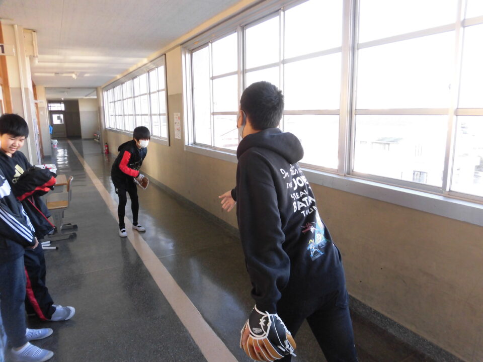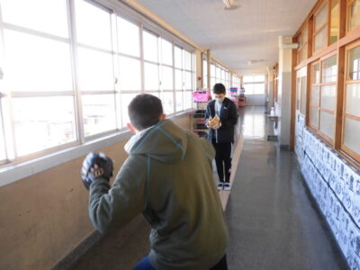 グローブをはめて、ボールをってみたいひとは、担任たんにん先生せんせい見守みまもなか廊下ろうかでそっとやってみました。