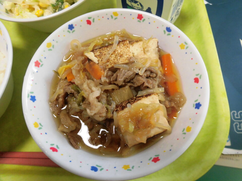 メニューは、ごはん麦入むぎいり)、牛乳ぎゅうにゅう松阪牛まつさかうしのすき、なばなのマヨネーズえでした。