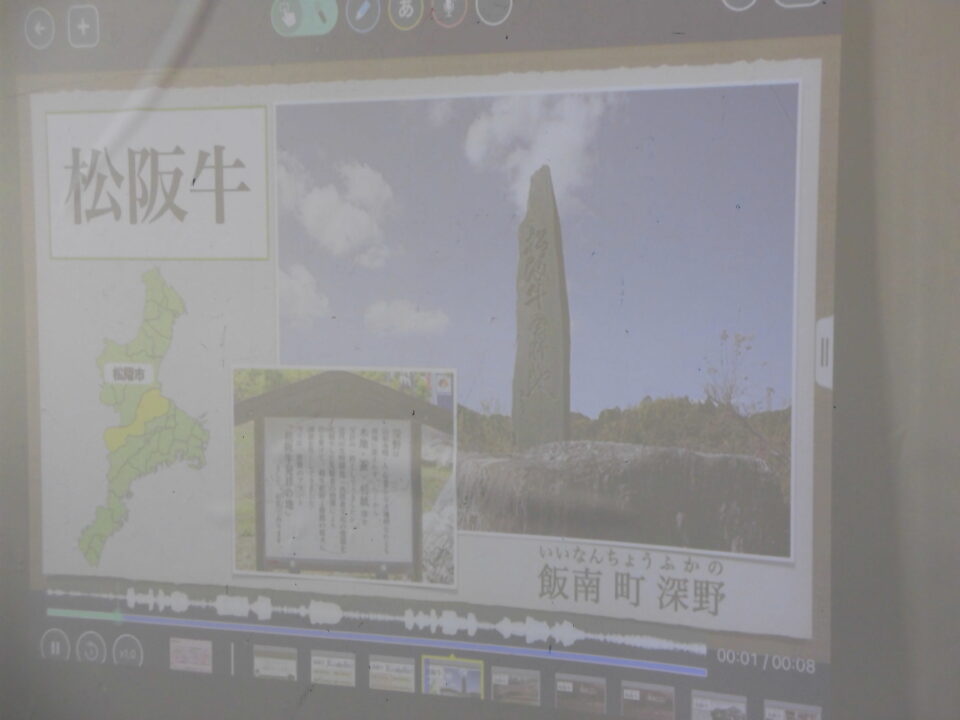 栄養えいよう先生せんせい松阪牛まつさかうしについての動画どうがつくってもらい、給食きゅうしょくべながらクイズや豆知識まめちしきがあり、たのしみながら松阪肉まつさかにく堪能たんのうしました。