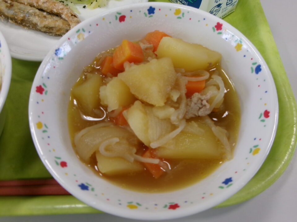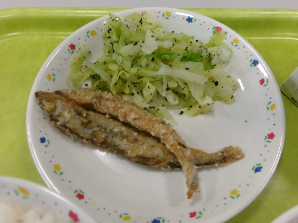 今日きょう給食きゅうしょくは、ごはん牛乳ぎゅうにゅう、ししゃものからげ、キャベツのあおじそえ、じゃがいものうまでした。