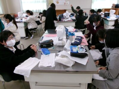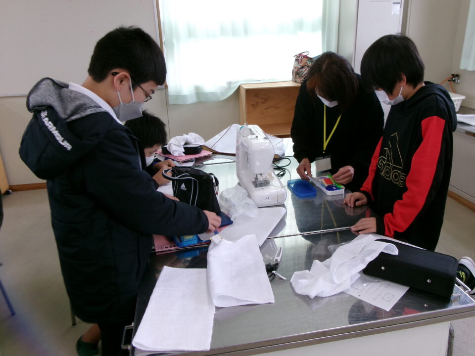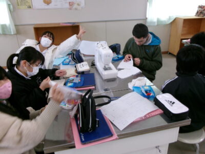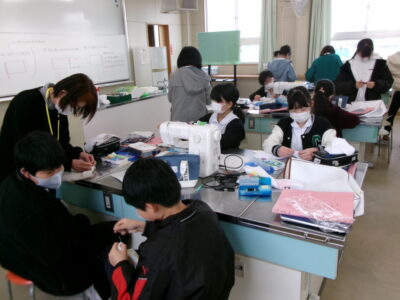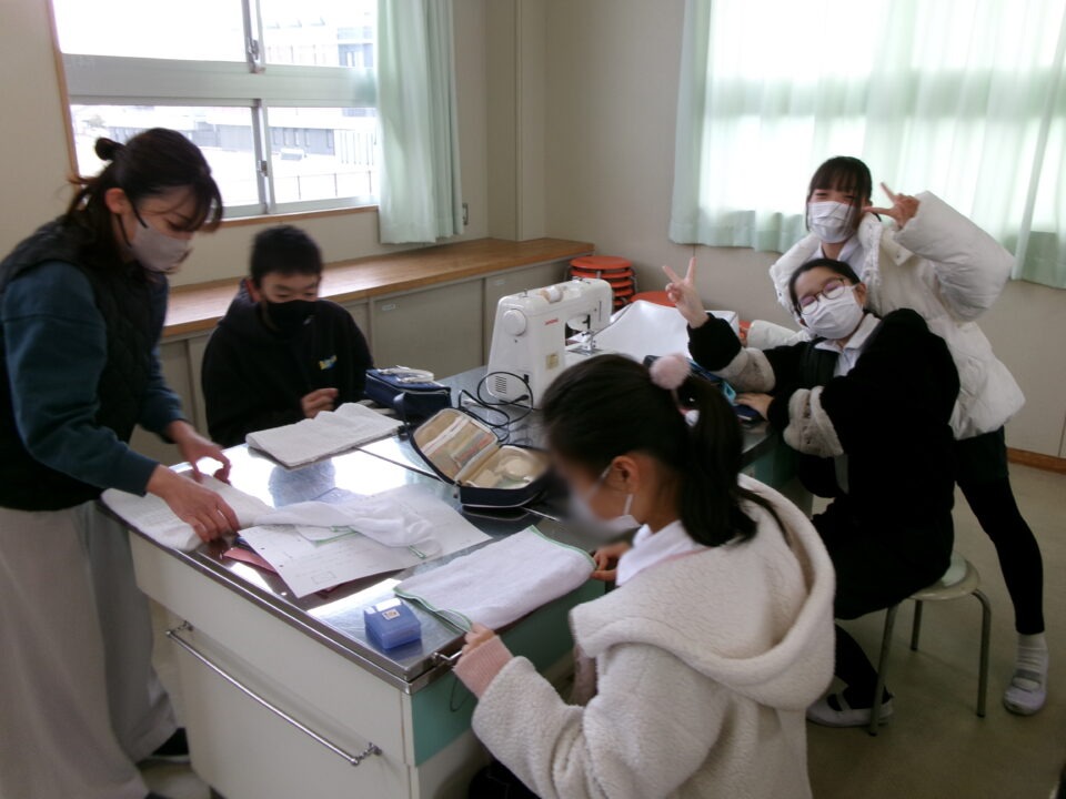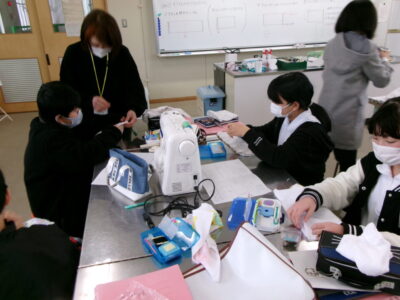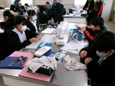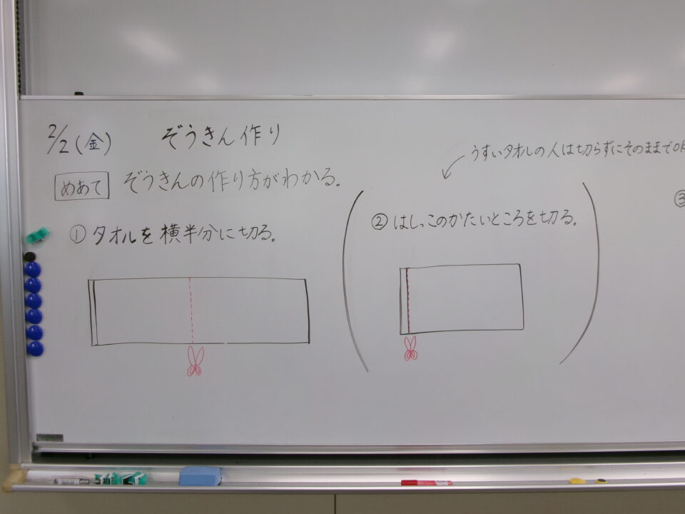 6年生では、古いタオルを再利用して、ぞうきんを作り、さらに活用することを考え、実習しています。