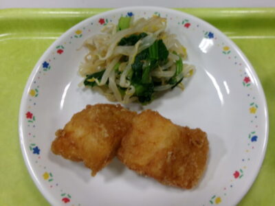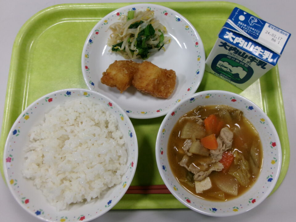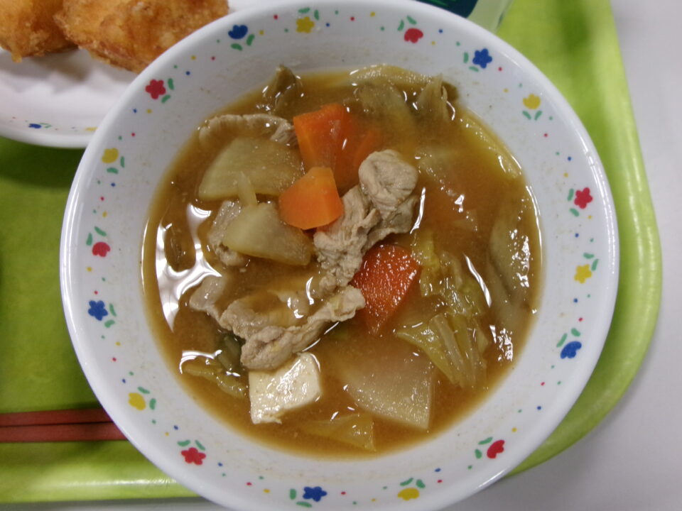 今日の給食は、ご飯(麦入り)、牛乳、いかのかりん揚げ、小松菜の和え物、豚汁でした。