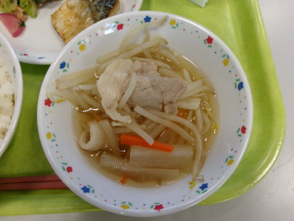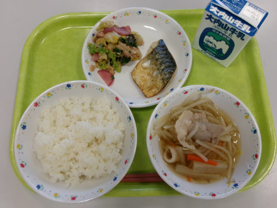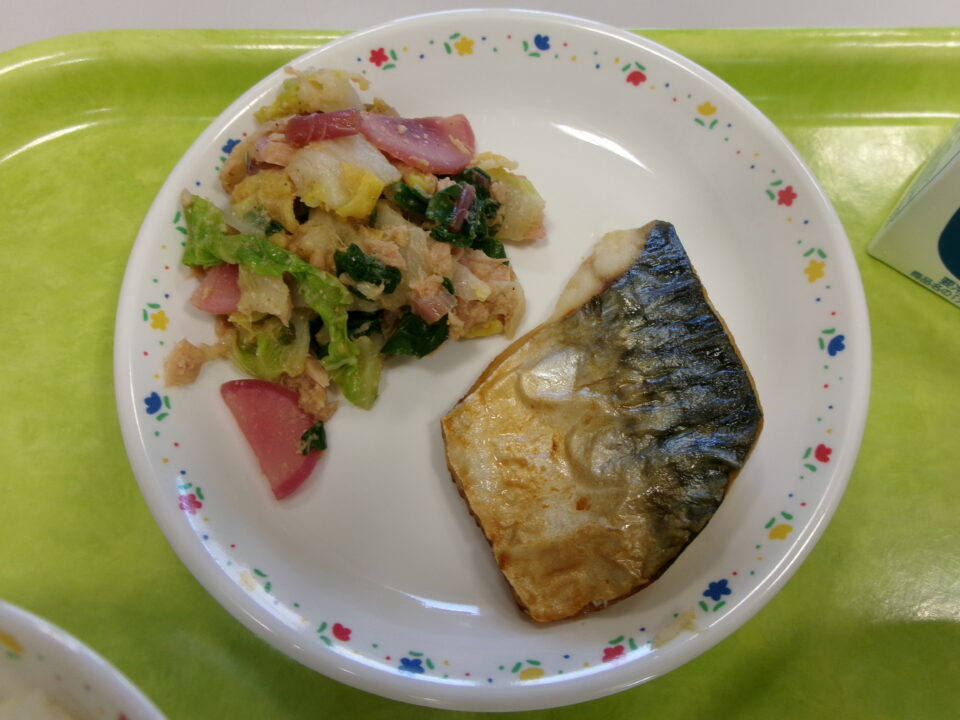 ご飯、牛乳、さばの塩焼き、松阪赤菜のツナ和え、沢煮椀でした。