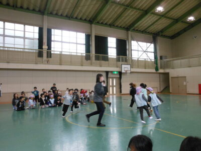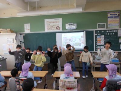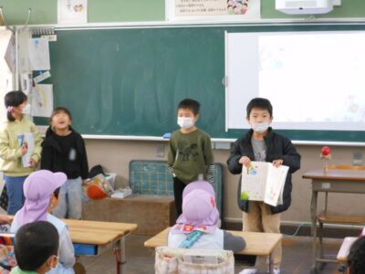 ホーム > 学校活動の様子 鎌田(かまだ)幼稚園(ようちえん)との交流会(こうりゅうかい)1年生(ねんせい) 今日(きょう)は、1年生(ねんせい)の子(こ)どもたちと鎌田(かまだ)幼稚園(ようちえん)の年長(ねんちょう)さんが交流会(こうりゅうかい)をしました。 はじめに、1年生(ねんせい)が校舎(こうしゃ)の中(なか)を案内(あんない)した後(あと)、1~3組(くみ)のそれぞれの教室(きょうしつ)で、幼稚園(ようちえん)の年長(ねんちょう)さんに小学校(しょうがっこう)の生活(せいかつ)を紹介(しょうかい)しました。勉強(べんきょう)や、休(やす)み時間(じかん)、給食(きゅうしょく)、校外活動(こうがいかつどう)などの様子(ようす)を写真(しゃしん)も交(まじ)えながら紹介(しょうかい)しました。また、音楽(おんがく)の時間(じかん)に習(なら)った歌(うた)を歌(うた)ったり、運動会(うんどうかい)で踊(おど)ったダンスを披露(ひろう)したりもしました。 最後(さいご)に体育館(たいいくかん)で「お誕生月(おたんじょうづき)なかま」の踊(おど)りを楽(たの)しみました。 今日(きょう)の給食(きゅうしょく)は、ご飯(はん)(麦(むぎ)入(い)り)、親子煮(おやこに)、牛乳(ぎゅうにゅう)、チンゲン菜(さい)と油(あぶら)揚(あ)げの和(あ)え物(もの)でした。 シェアする Twitter でシェア はてなブックマークに保存 LINE でシェア Facebook でシェア Pocket に保存 Feedly で購読 関連投稿 学校活動の様子 授業参観 引き渡し訓練 学校活動の様子 1年生(ねんせい)の引(ひ)き渡(わた)し訓練(くんれん)をしました。 学校活動の様子 外国(がいこく)のことを知(し)ろう!4年生(ねんせい) 学校活動の様子 / コミュニティ・スクール CS放課後学習会(ほうかごがくしゅうかい)2.3年(ねん) 学校活動の様子 マックスバリュ見学(けんがく)(3-2) 学校活動の様子 学習(がくしゅう)の様子(ようす)4年生(ねんせい)、3年生(ねんせい) 前の投稿 学習(がくしゅう)の様子(ようす)3・4・5年生(ねんせい) 次の投稿 掃除機(そうじき)を寄贈(きぞう)していただきました。