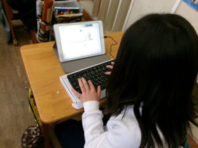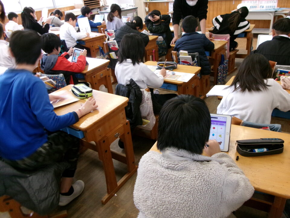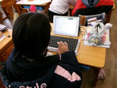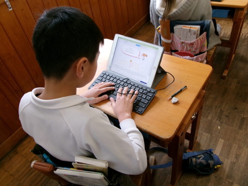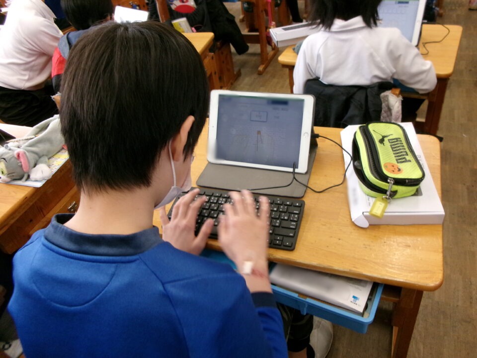 3-3では、ローマ字の練習をしていました。タブレット端末のアプリPlaygramを使ってローマ字打ちのタイピング練習をしている子も多く、がんばっていましたね。