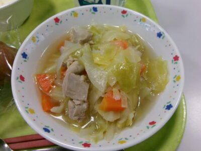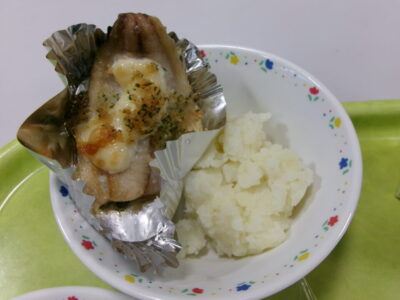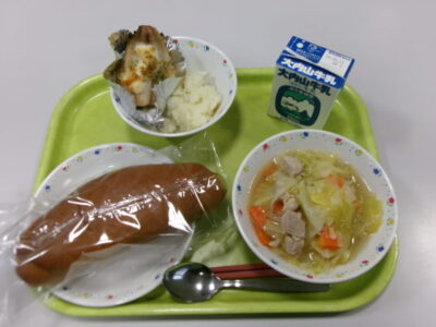 今日の給食は、黒糖パン、牛乳、あじの香草焼き、粉ふきいも、とり肉と野菜のスープ煮でした。
