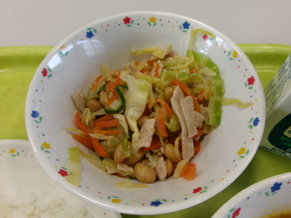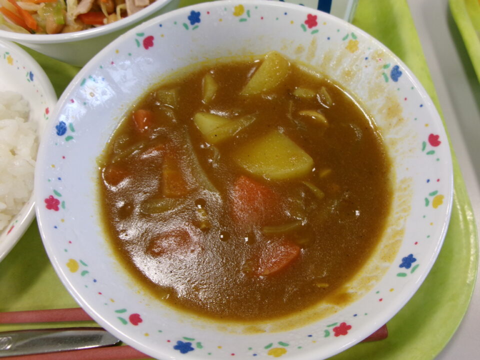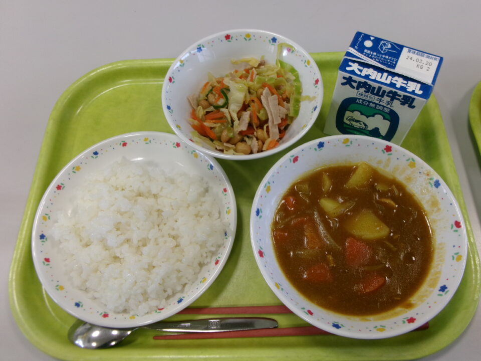 本日のメニューは、ご飯、チキンカレー、牛乳、大豆入りサラダでした。