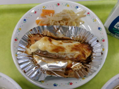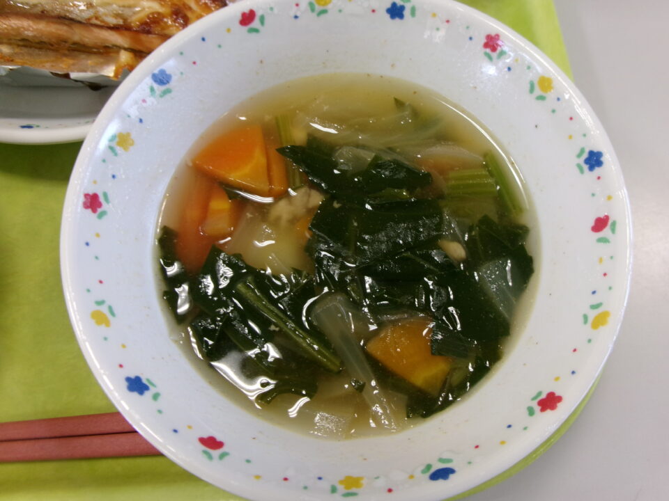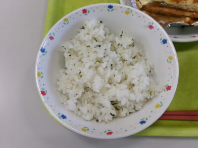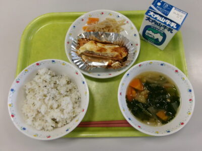 今日の給食は、菜飯(麦入り)、牛乳、さけのマヨネーズ焼き、もやしのごま和え、とり肉とほうれん草のスープでした。