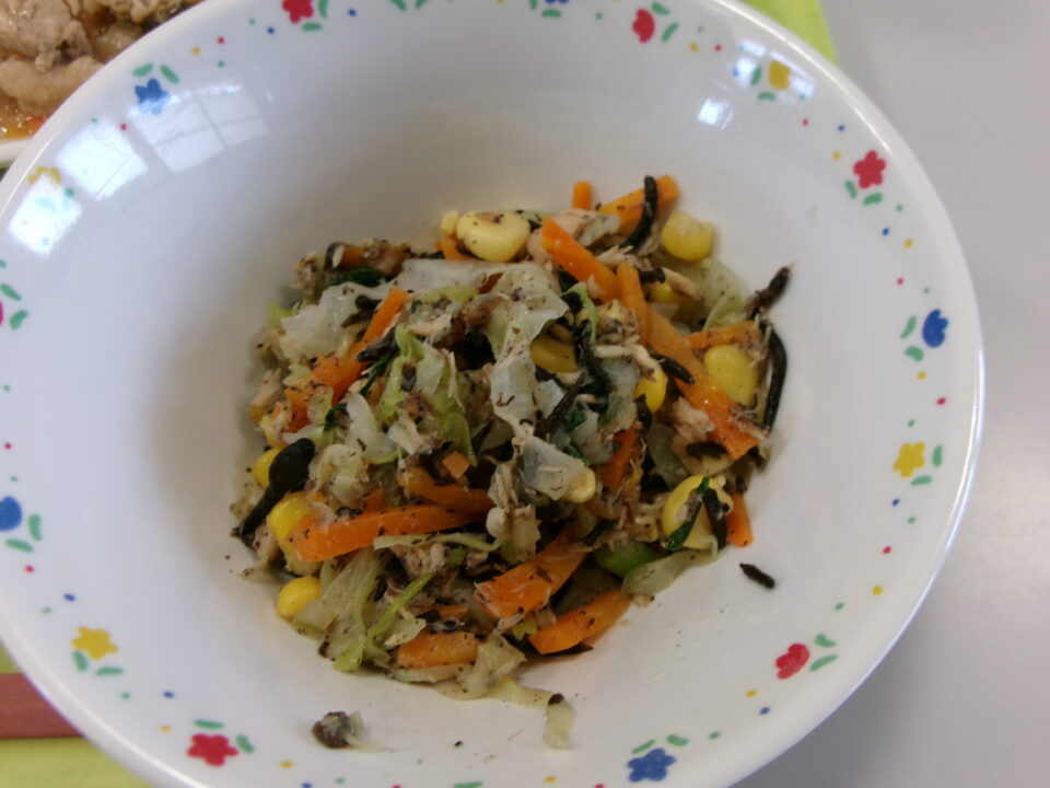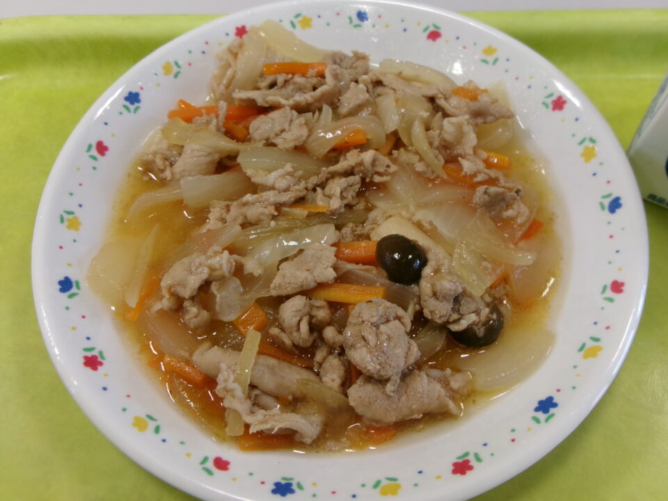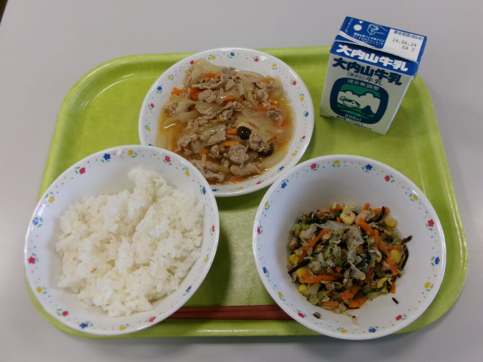 今日の給食は、ご飯、牛乳、豚肉と新たまねぎのしょうが炒め、ひじきサラダでした。