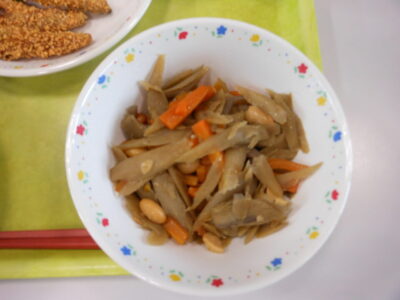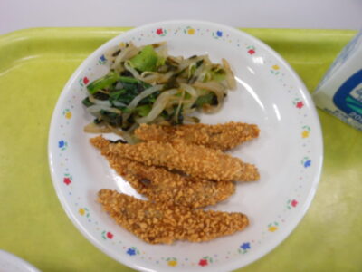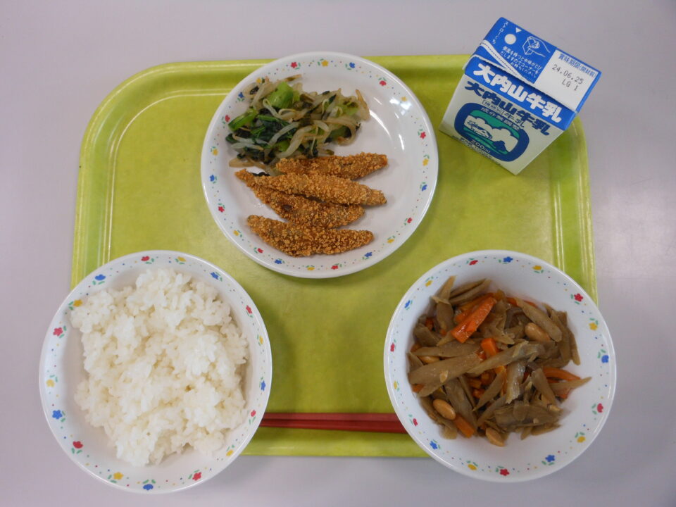 今日の給食は、ご飯、牛乳、きびなごのかりかりフライ、小松菜ともやしのいそ和え、五目きんぴらでした。