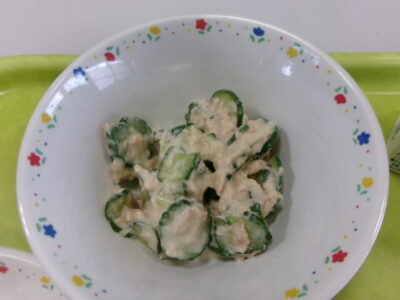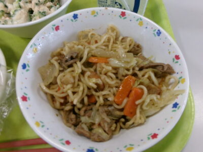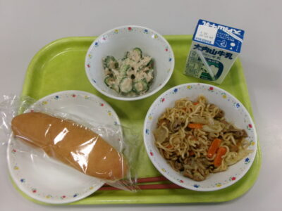 今日の給食は、小型コッペパン(横切り)、ツナときゅうりのサラダ、牛乳、具だくさん焼きそばでした。