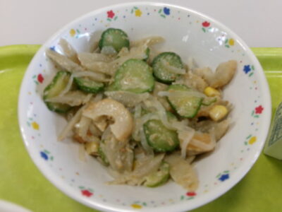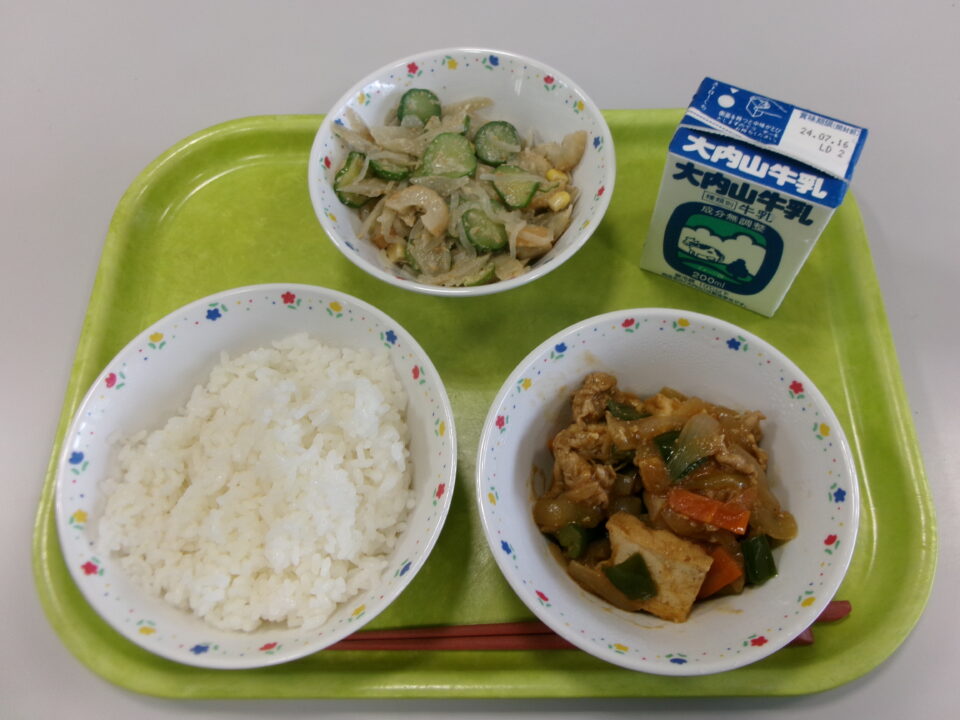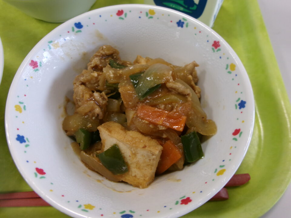 今日の給食は、ご飯、牛乳、豚肉と厚揚げのみそ炒め、ごぼうサラダでした。