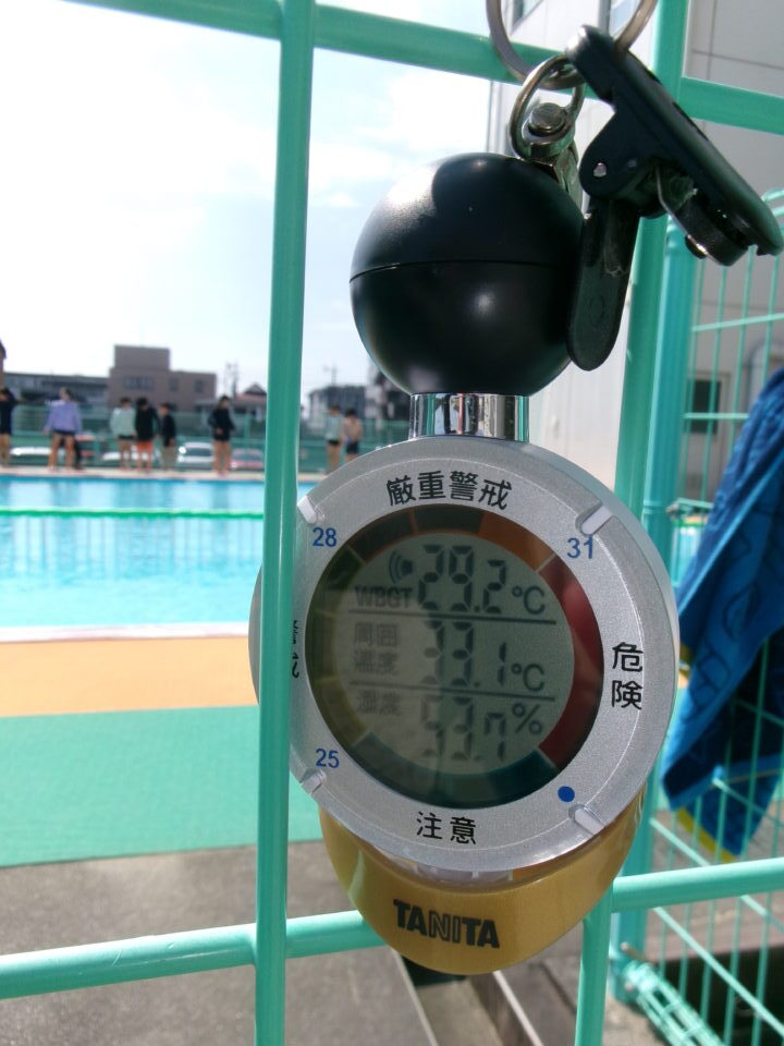 松阪市の学校では、暑さ指数(WBGT)を測定し、暑さ指数が31以上の場合は「危険」となり、原則、運動中止となっています。