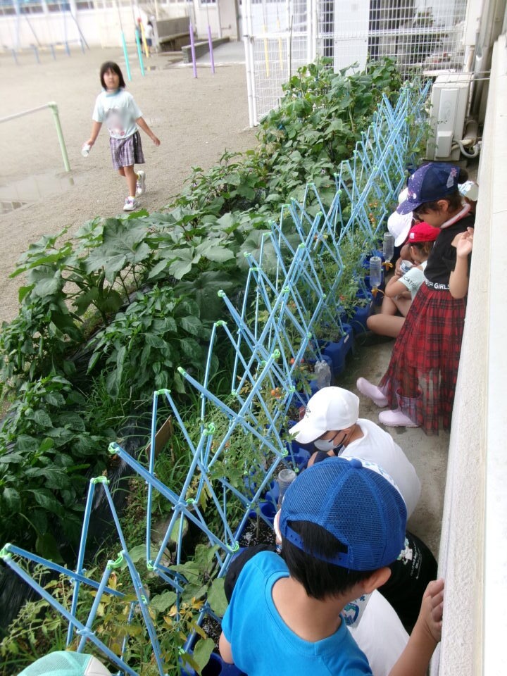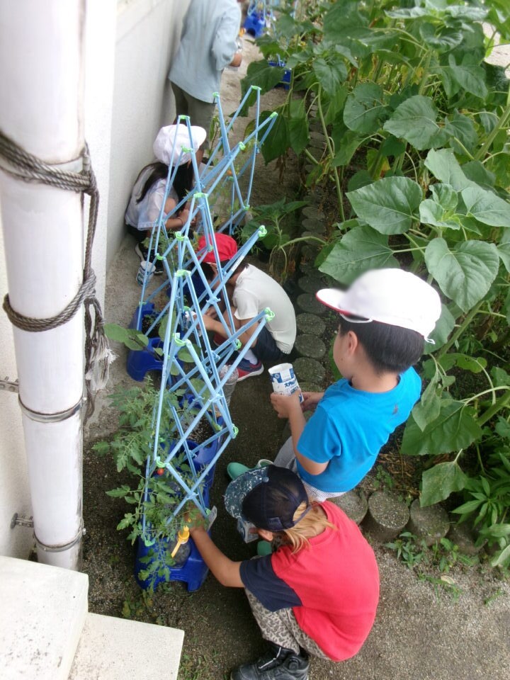 生活科では、育てている野菜に肥料をまきました。ミニトマトはもうすでに赤くなってきています。