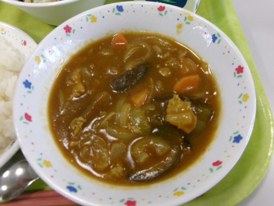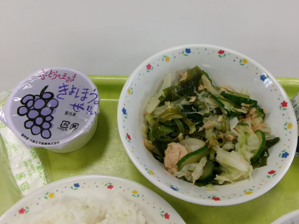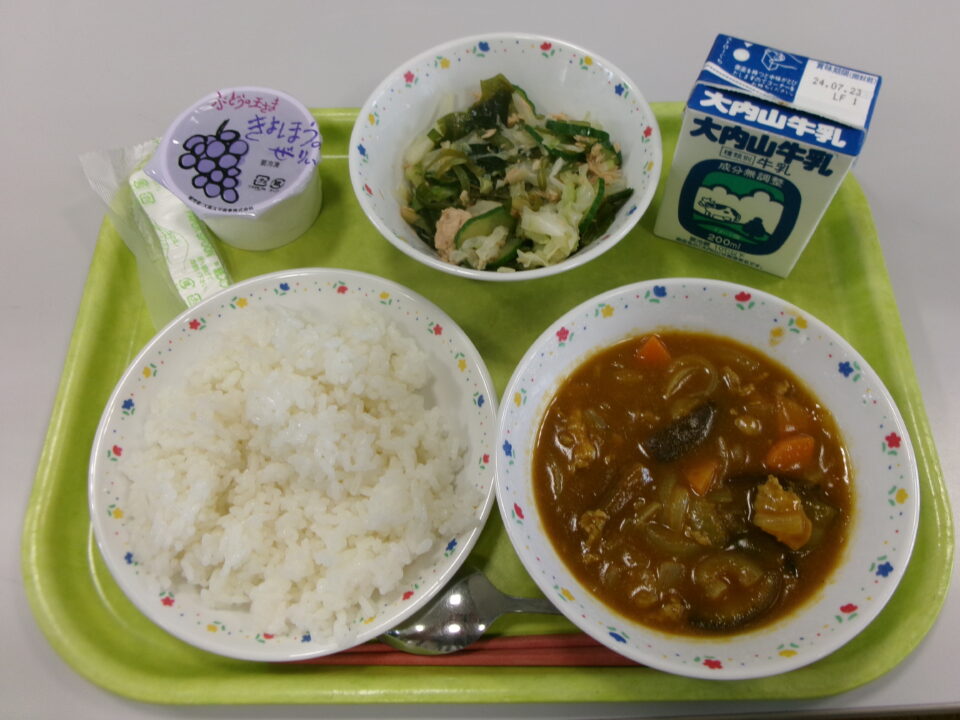 ご飯、まごころきらきらカレー、牛乳、海藻サラダ、巨峰ゼリーでした。