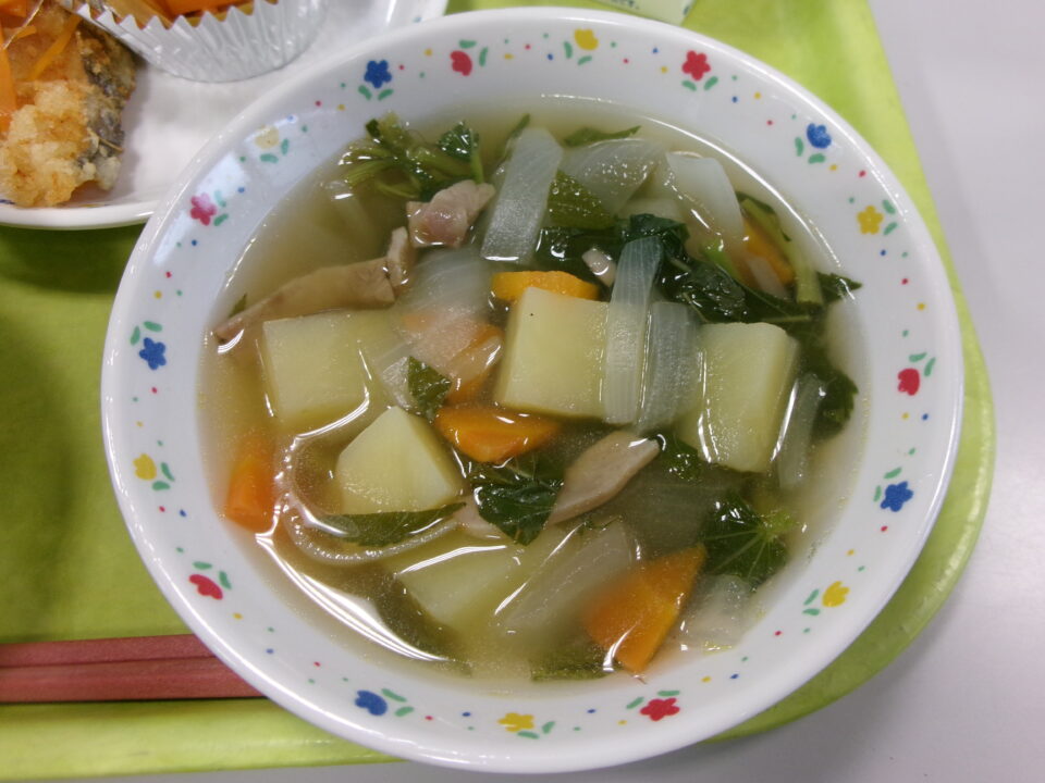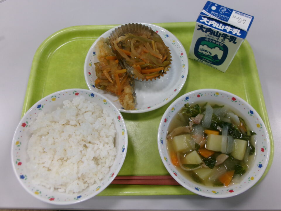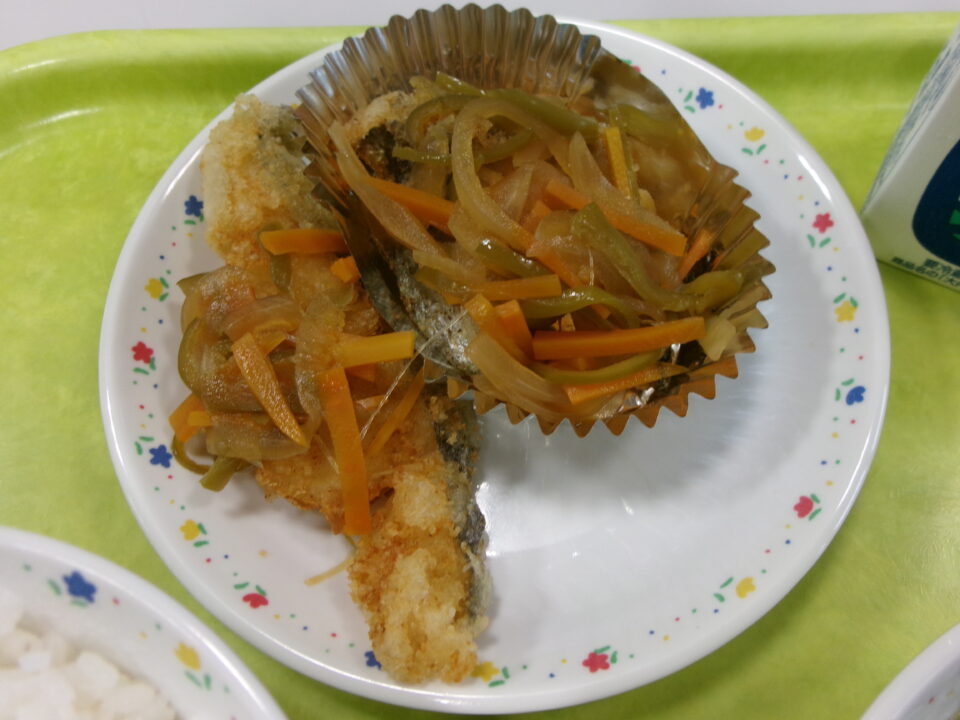 今日きょう給食きゅうしょくは、ごはん麦入むぎいり)、牛乳ぎゅうにゅう、ホキの南蛮漬なんばんづけ、モロヘイヤスープでした。