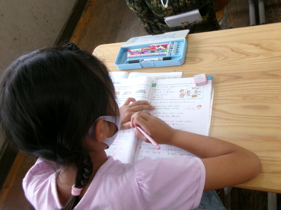 2年生の算数の時間です。問題の中の大事なところに線を引いたり、〇で囲んだりしています。問題の中から大事なところを落とさず、見つけられる力をつけることが大切です。