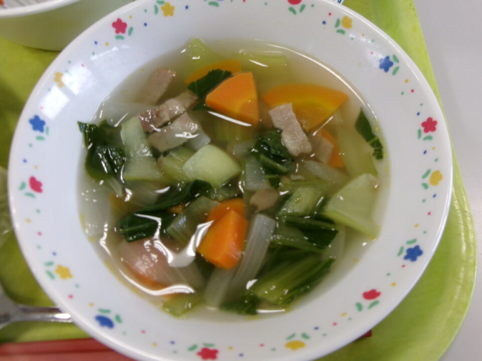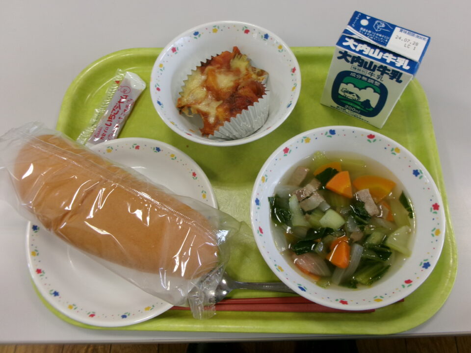 今日きょう給食きゅうしょくは、コッペパン、牛乳ぎゅうにゅう、ポテトミートグラタン、野菜やさいのスープ、いちごジャムでした。