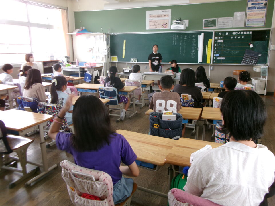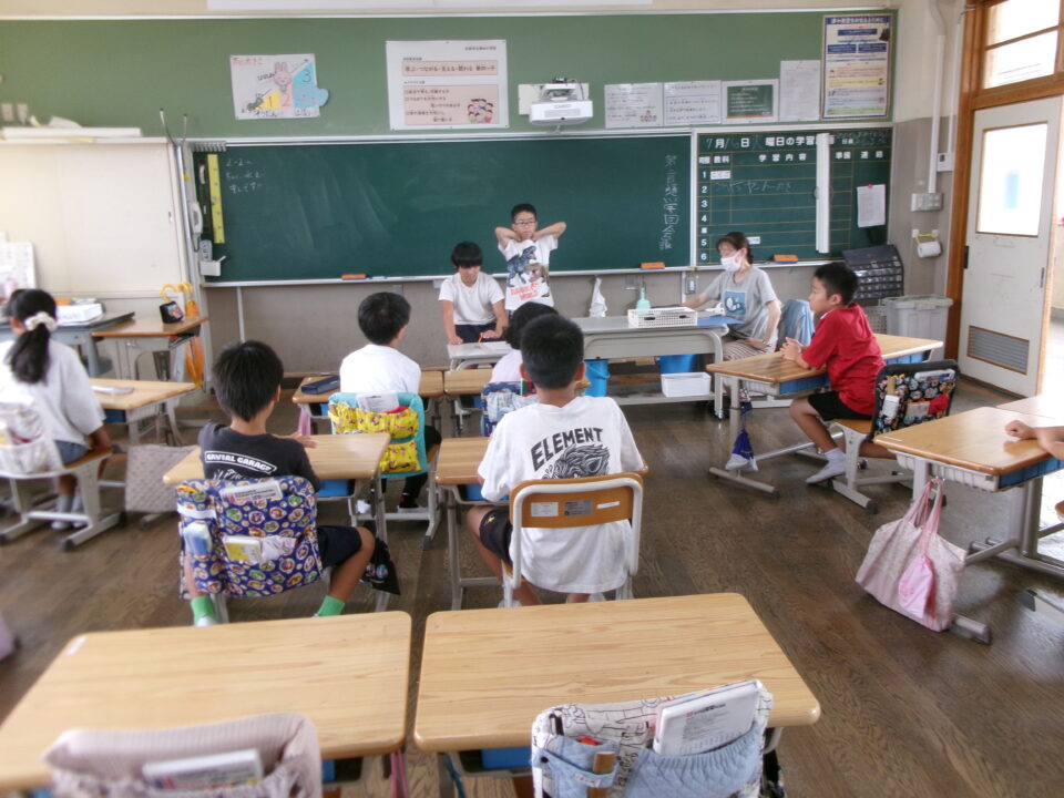 通学団会つうがくだんかいでは、4がつからの登下校とうげこう様子ようすなどでふりかえりをしたり、地区ちくあぶないなとおもっていることはないかなど、みんなであつまってはない、先生せんせいからも夏休なつやすみにけてはなしをしました。