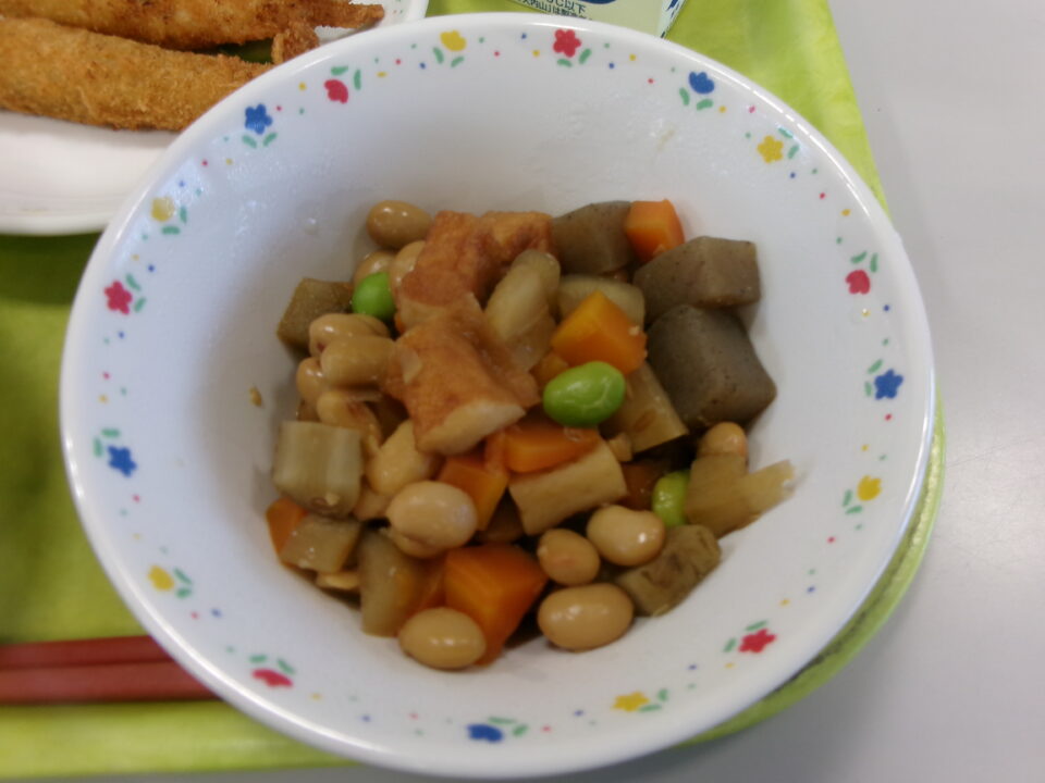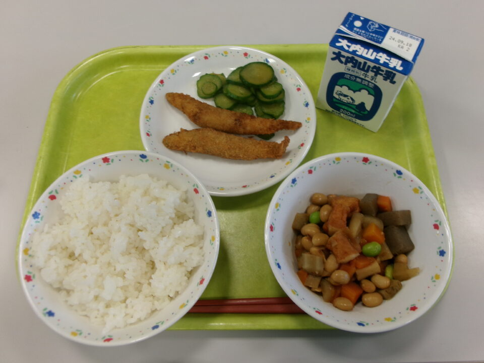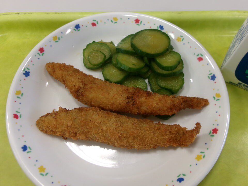 今日きょう献立こんだては、ごはん牛乳ぎゅうにゅう、ししゃもフライ、きゅうりの即席漬そくせきづけ、いろどり煮豆にまめでした。