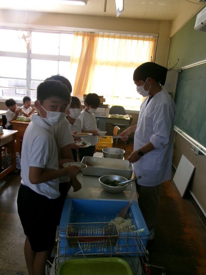 どもたちは、4限目げんめわるとまず、給食当番きゅうしょくとうばんさんがあらいにき、エプロンをつけて準備じゅんびはじめます。